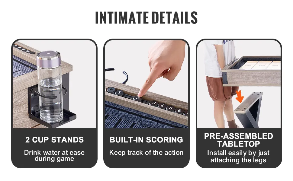 Detalles bien pensados: El tejo incluye dos soportes para vasos, lo que te permite tener tus bebidas a mano. El marcador integrado registra la acción, para que puedas concentrarte en tu juego. El tablero preensamblado solo requiere colocar las patas, lo que facilita y agiliza el montaje
