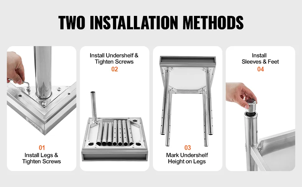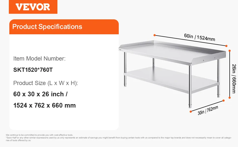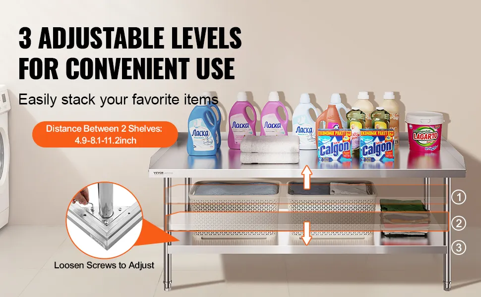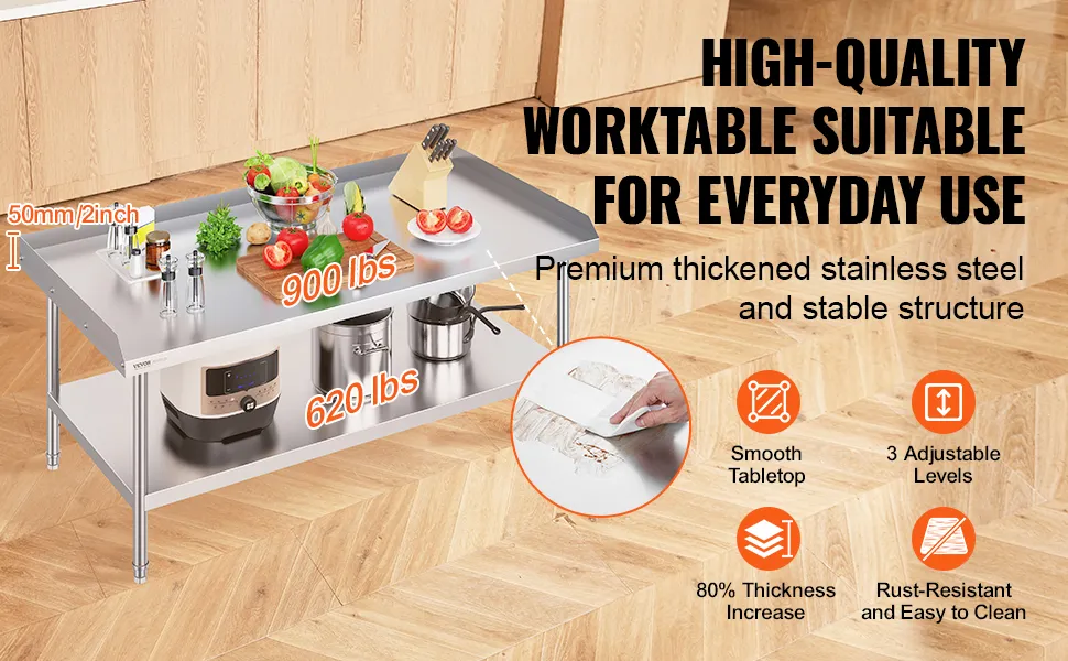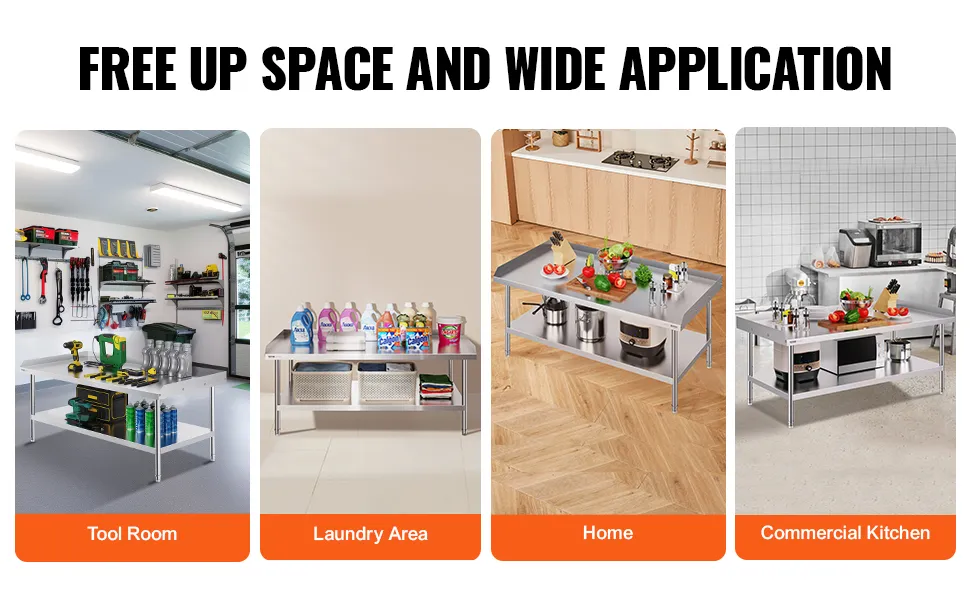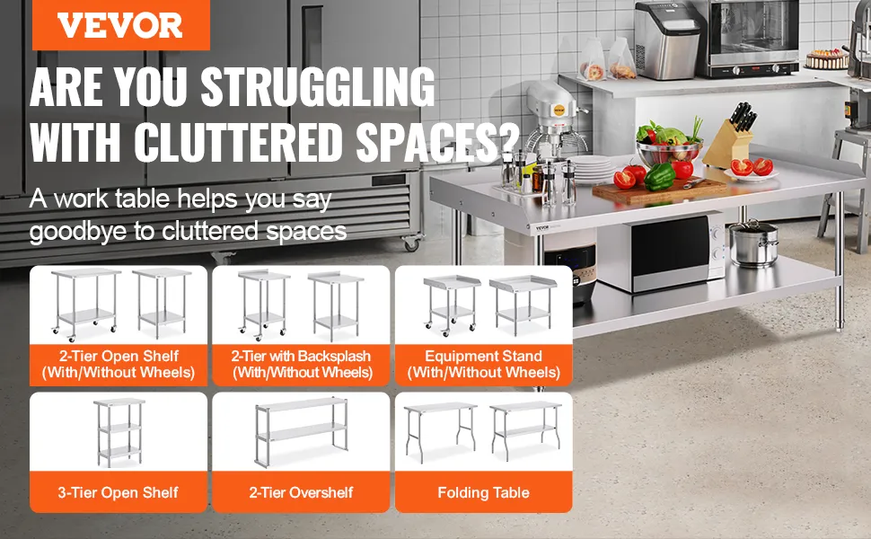 La mesa de trabajo de acero inoxidable VEVOR es perfecta para cualquier cocina. Su construcción de acero inoxidable la hace muy duradera. Este material es resistente al óxido y la corrosión. Puede utilizarla tanto en cocinas comerciales como domésticas. Es ideal para la preparación y el almacenamiento de alimentos y como espacio de trabajo. El protector contra salpicaduras de 3 lados mantiene su área limpia. Esta mesa se adapta bien a cualquier cocina, panadería o restaurante. Es estéticamente agradable. El diseño elegante la hace increíblemente versátil, ampliando su espacio de trabajo. Nuestra mesa puede soportar un uso intensivo. Sin embargo, la diseñamos para satisfacer las demandas de las cocinas concurridas. Por lo tanto, la mesa le ayudará a mantener su trabajo organizado. Y así, puede utilizarla de manera eficaz para una gestión eficiente de la cocina.