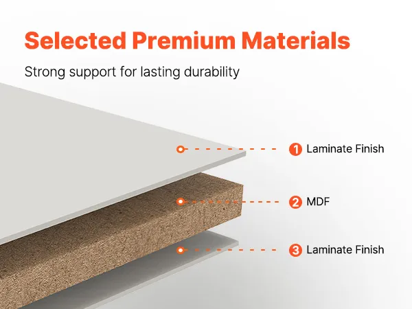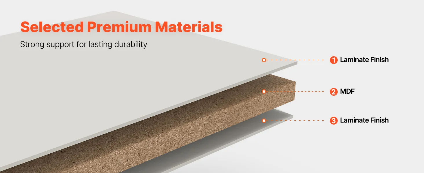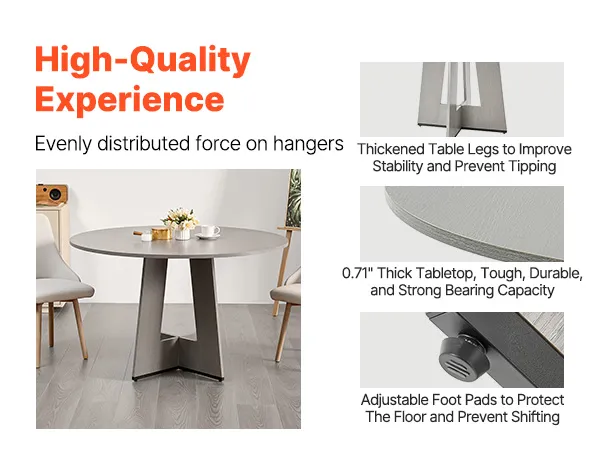Materiales de alta calidad: El tablero de la mesa está hecho de una combinación de MDF y acabado laminado, lo que no solo le da un aspecto elegante y estético, sino que también proporciona características funcionales excepcionales. El MDF ofrece una base de superficie sólida y lisa, mientras que el acabado laminado mejora la resistencia de la mesa al desgaste, los rayones y las manchas, protegiendo eficazmente nuestra mesa de comedor de madera de pequeños rayones y derrames