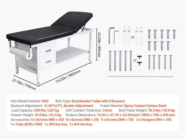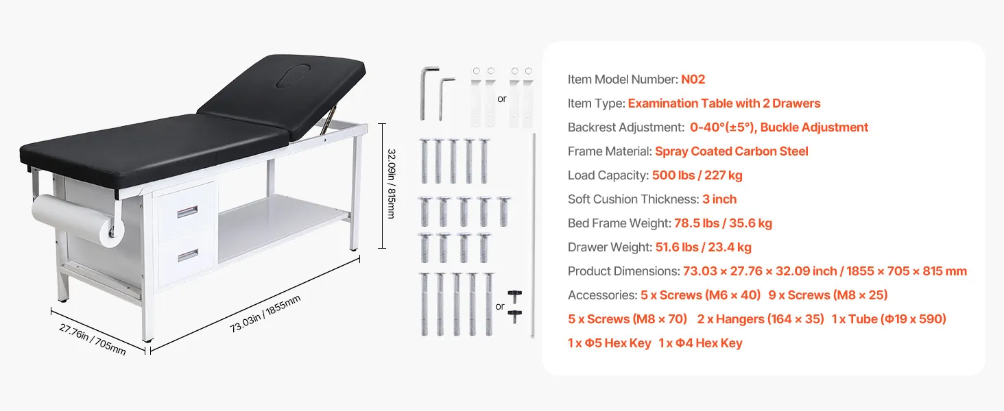 VEVOR Mesa de Exploración Médica, Respaldo Ajustable, con 2 Cajones, Estante de Almacenamiento y Dispensador de Rollos de Papel para Hospitales y Centros de Rehabilitación, 1855 x 705 x 815 mm