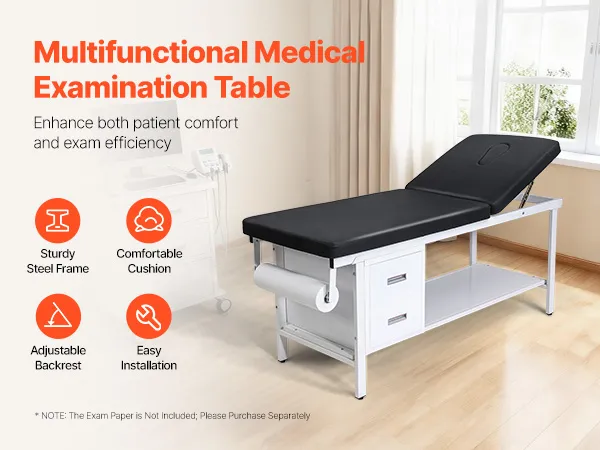 Diseño práctico: Esta camilla de exploración cuenta con un estante inferior y dos cajones, que ofrecen un espacio de almacenamiento ordenado para instrumental médico, documentos y suministros. También incluye un portarrollos para facilitar la dispensación y el reemplazo del papel (papel no incluido)