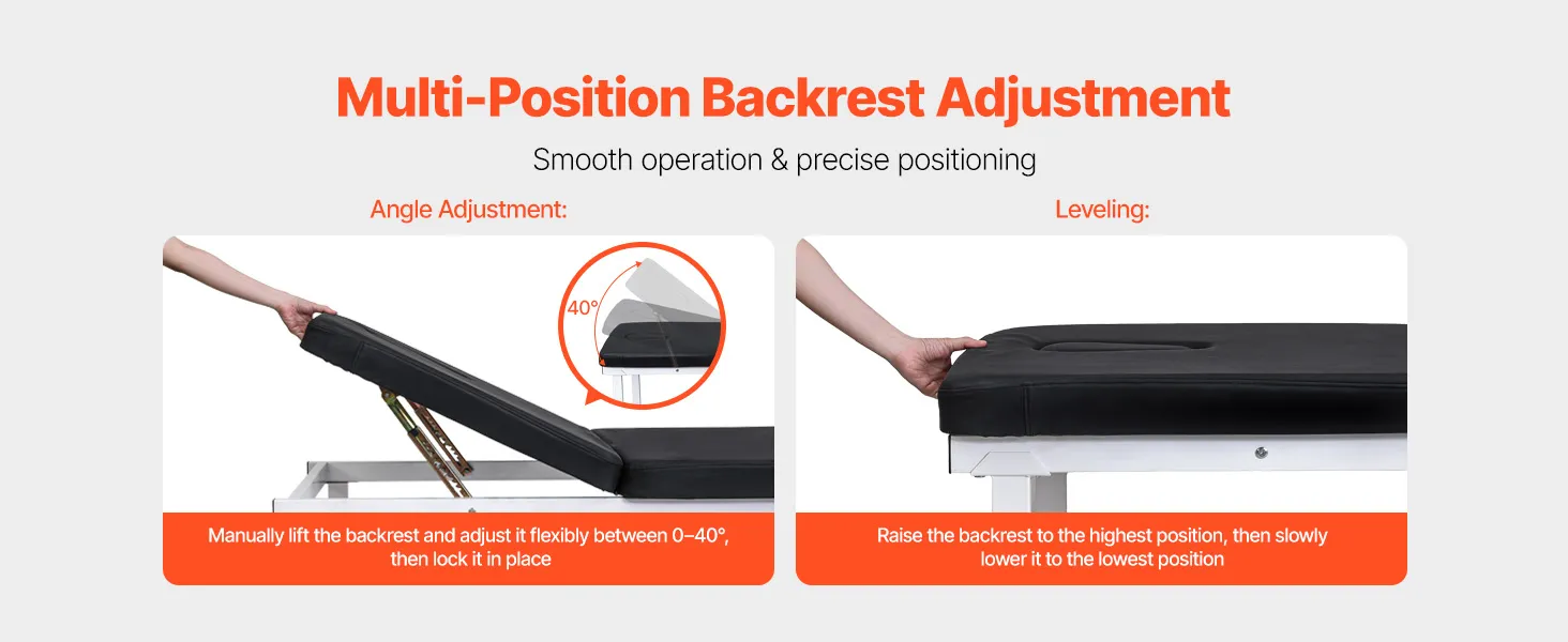 Respaldo ajustable de 0° a 40°: Se adapta fácilmente a las diferentes necesidades de exploración. Con un práctico sistema de ajuste mediante hebilla, esta camilla de fisioterapia permite ajustar el ángulo del respaldo sin esfuerzo, mejorando así la comodidad del paciente y la eficacia de la exploración