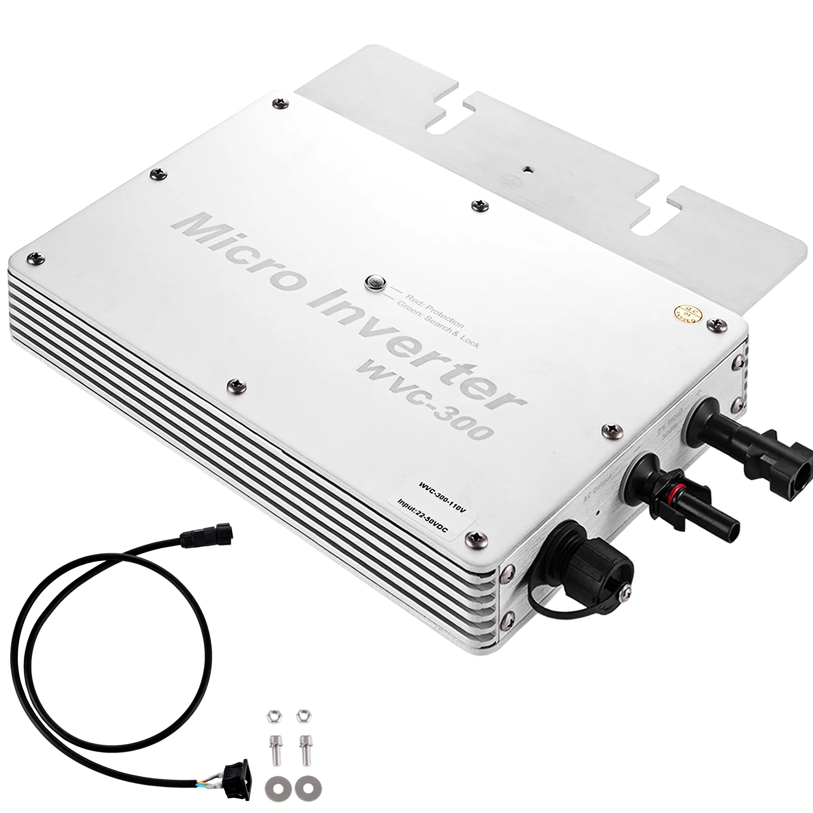 Diseñado de tamaño pequeño y liviano, fácil de usar. El paquete incluye 1 inversor de conexión a la red de 300 W, 1 conector en T, 1 cable de alimentación de 1,5 m, 1 conjunto de accesorios de montaje y 1 manual del producto.