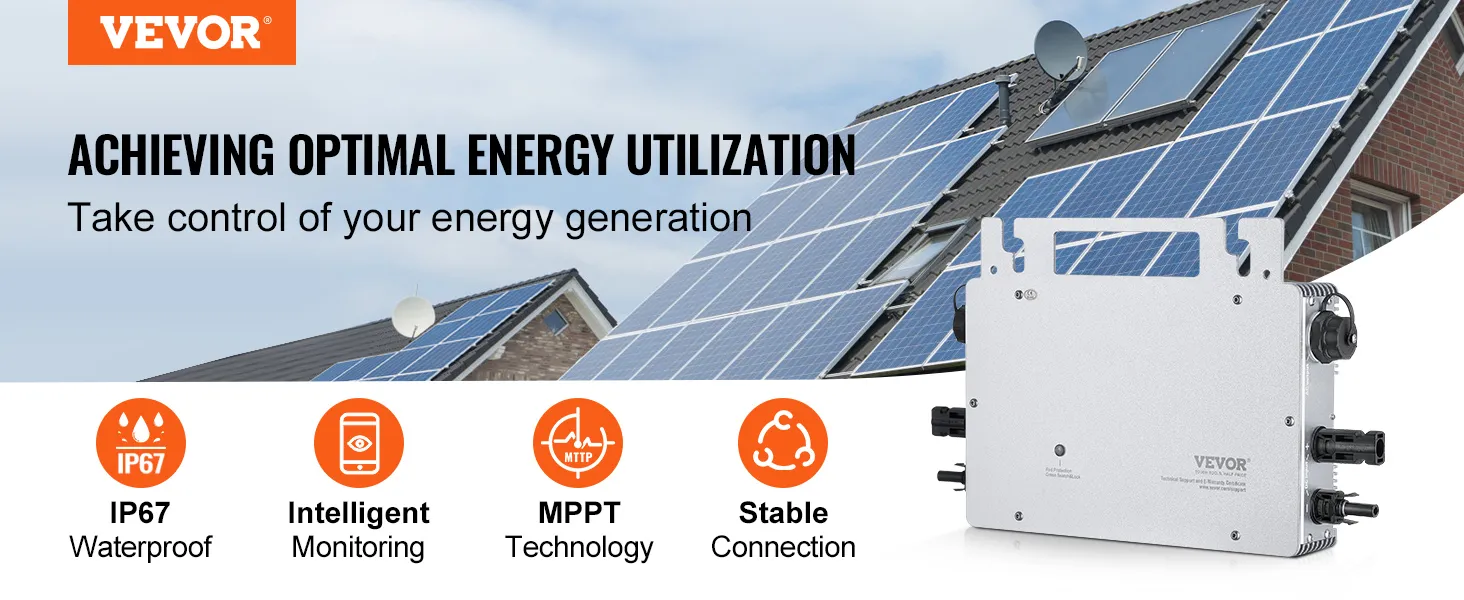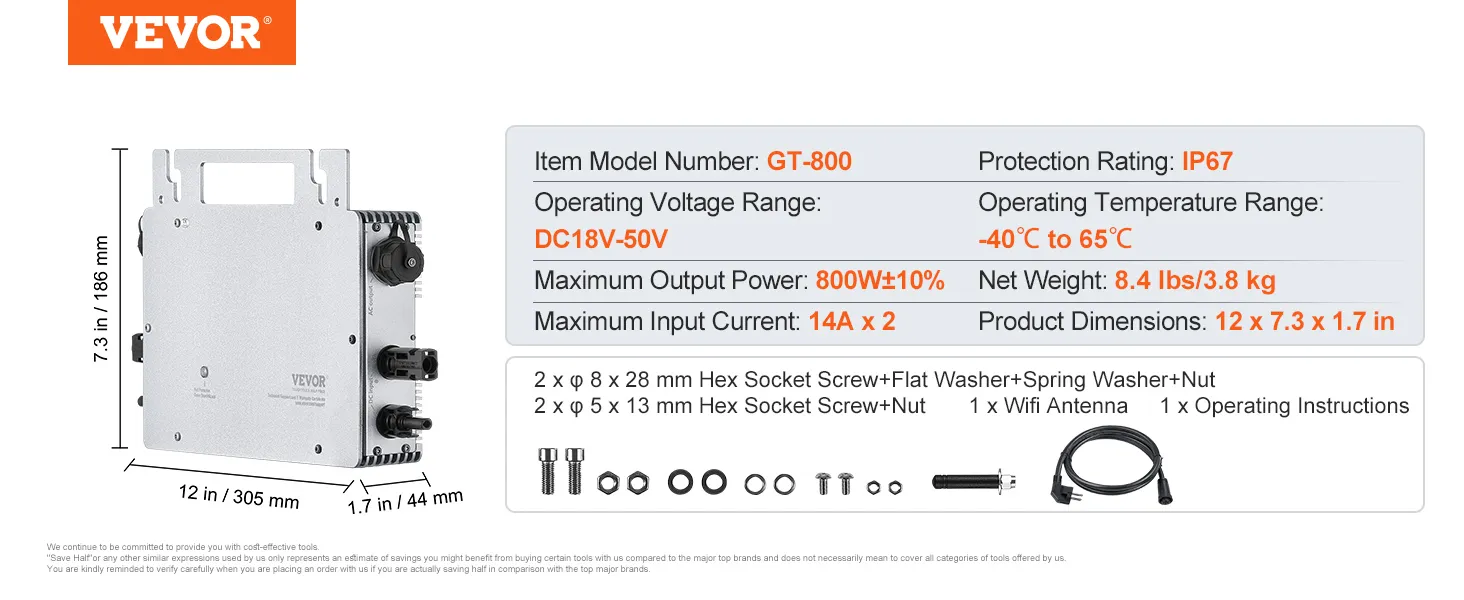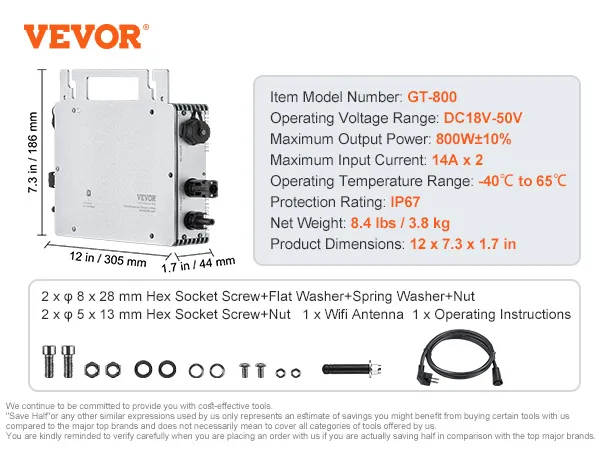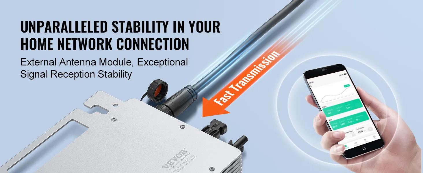 VEVOR Micro Inversor Solar Conexión a Red 800W Microinversor Solar IP67 Aleación de Aluminio Impermeable Voltaje CC 18-50V con Antena WiFi APP Cable de Alimentación para Sistemas de Paneles Solares