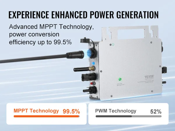 Conversión de energía de alta eficiencia: nuestro inversor tiene una potencia máxima de 800 W y un rango de voltaje de funcionamiento de CC 18 V-50 V, admitiendo 2 grupos de acceso a módulos de paneles solares. Con nuestra avanzada tecnología MPPT, la eficiencia de conversión de energía alcanza el 99,5%. Con una eficiencia tan alta, verás un aumento notable en tu producción de energía, aprovechando al máximo tus recursos renovables.