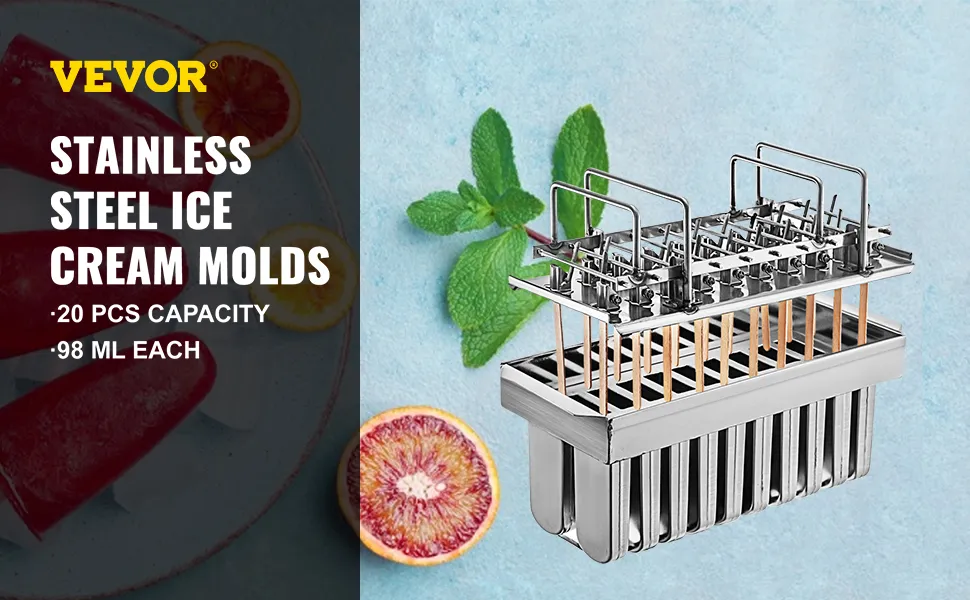 El modelo de hielo de acero inoxidable de 20 piezas es de alta calidad con una capacidad de 98 ml cada una. Adopta tecnología de soldadura sin costuras para garantizar una superficie lisa y sin residuos de manchas. Puede ayudarte a preparar deliciosos postres helados usando jugo, gelatina, fruta, helado y pudín, etc.