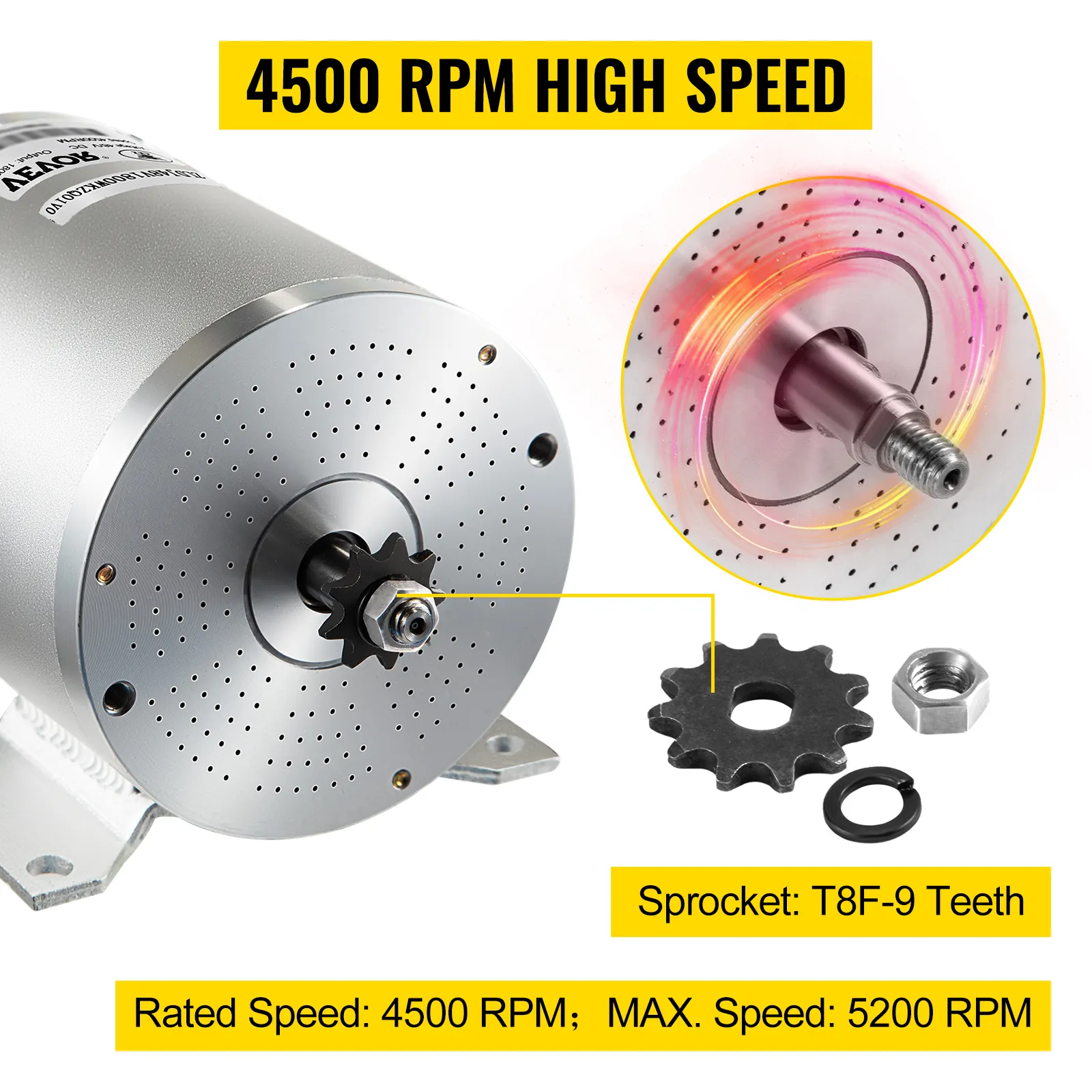Es de aproximadamente 48 V 1.800 W DC motor eléctrico, tipo cepillado, con controlador de velocidad. Piñón para cadena #25, velocidad nominal de 4.500 RPM. El motor cepillado es un perfecto sustituto de su motor roto o viejo, puede ser utilizado para e-bike, scooter, mini bici o go-kart.