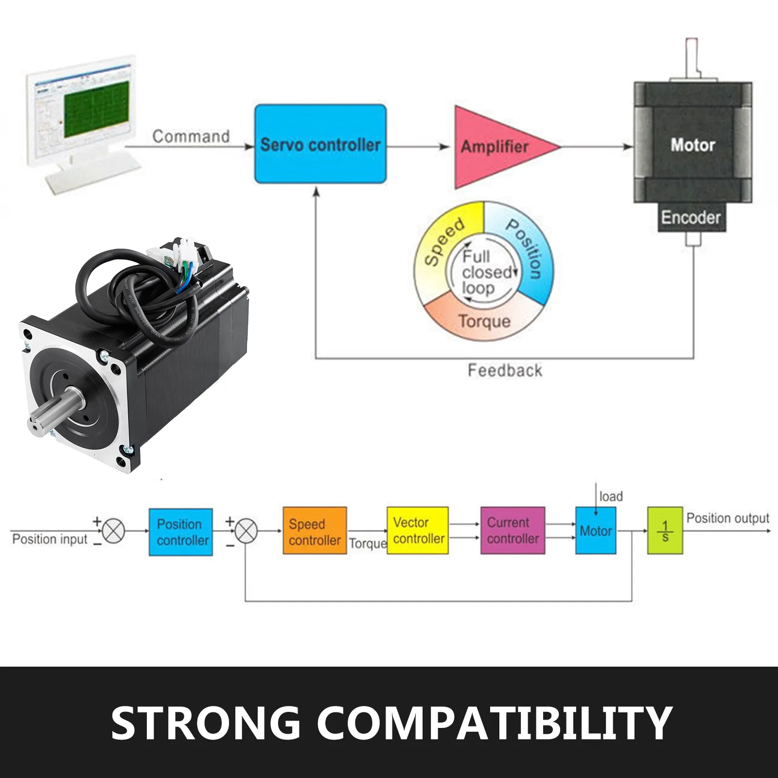 Control de bucle cerrado completo, compatible con codificador de 1.000 líneas. No hay ajuste en la aplicación general. Sin pérdida de paso, alta precisión en posición, cercana al 100% del par de salida.