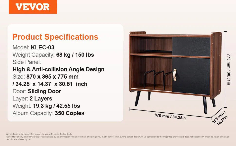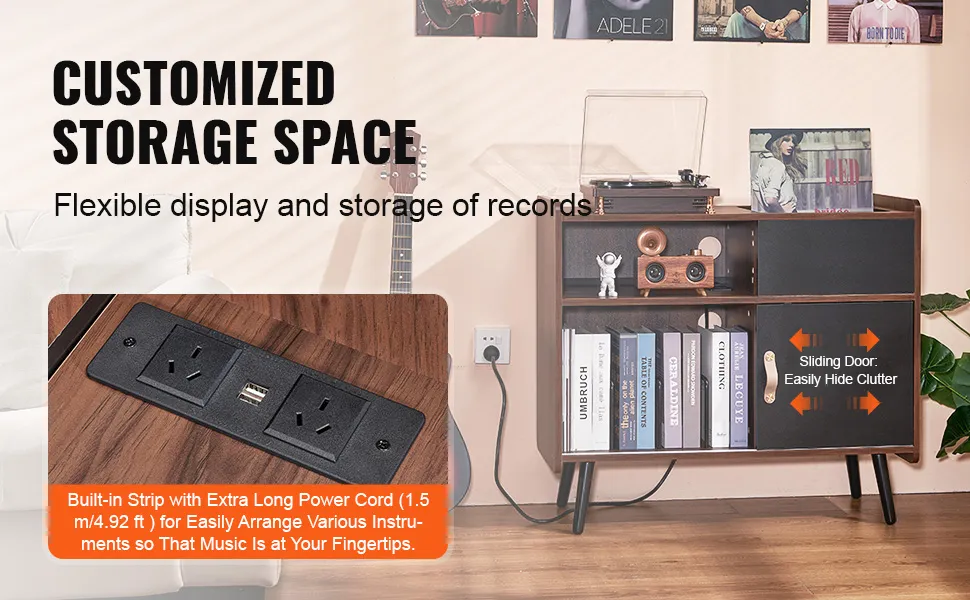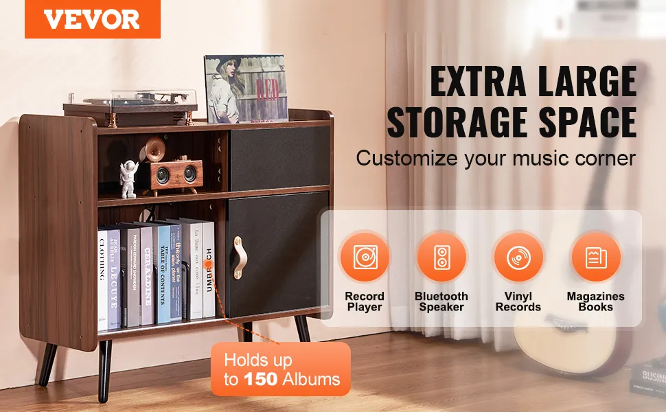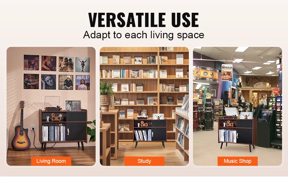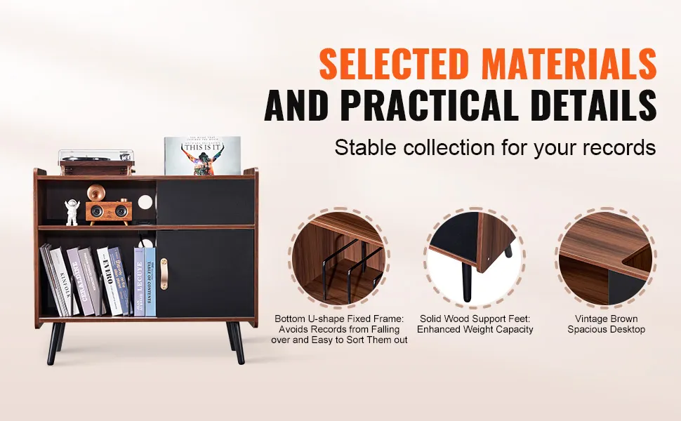 Puerta corrediza: Este estante para tocadiscos presenta un diseño de puerta corrediza, lo que brinda opciones de almacenamiento flexibles para clasificar y organizar fácilmente sus tesoros musicales.