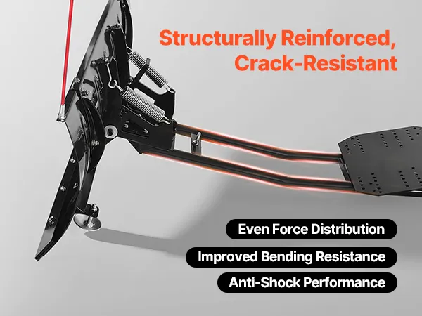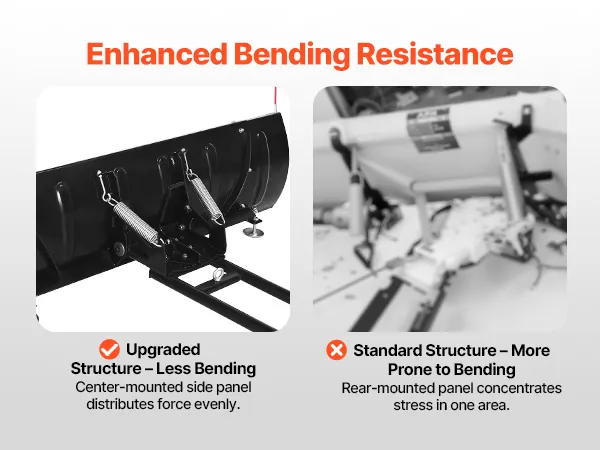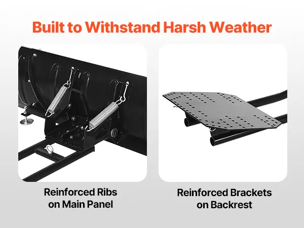 Robusto y duradero: Este quitanieves para ATV cuenta con una placa principal reforzada y un soporte de respaldo para una mayor resistencia estructural. El borde inferior está equipado con una banda de goma resistente al desgaste para mayor protección contra impactos. Las paredes laterales están optimizadas con soportes curvos para una mayor resistencia a la flexión, diseñadas para condiciones de trabajo exigentes
