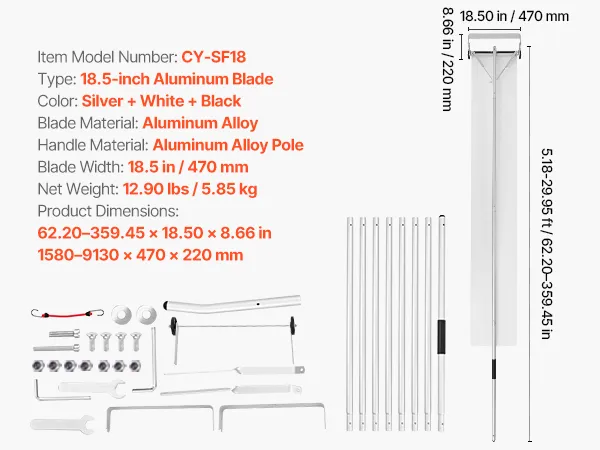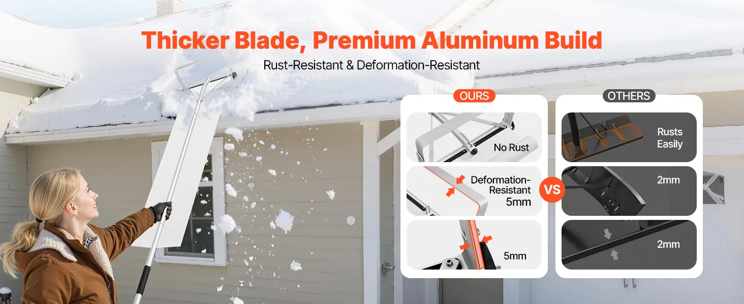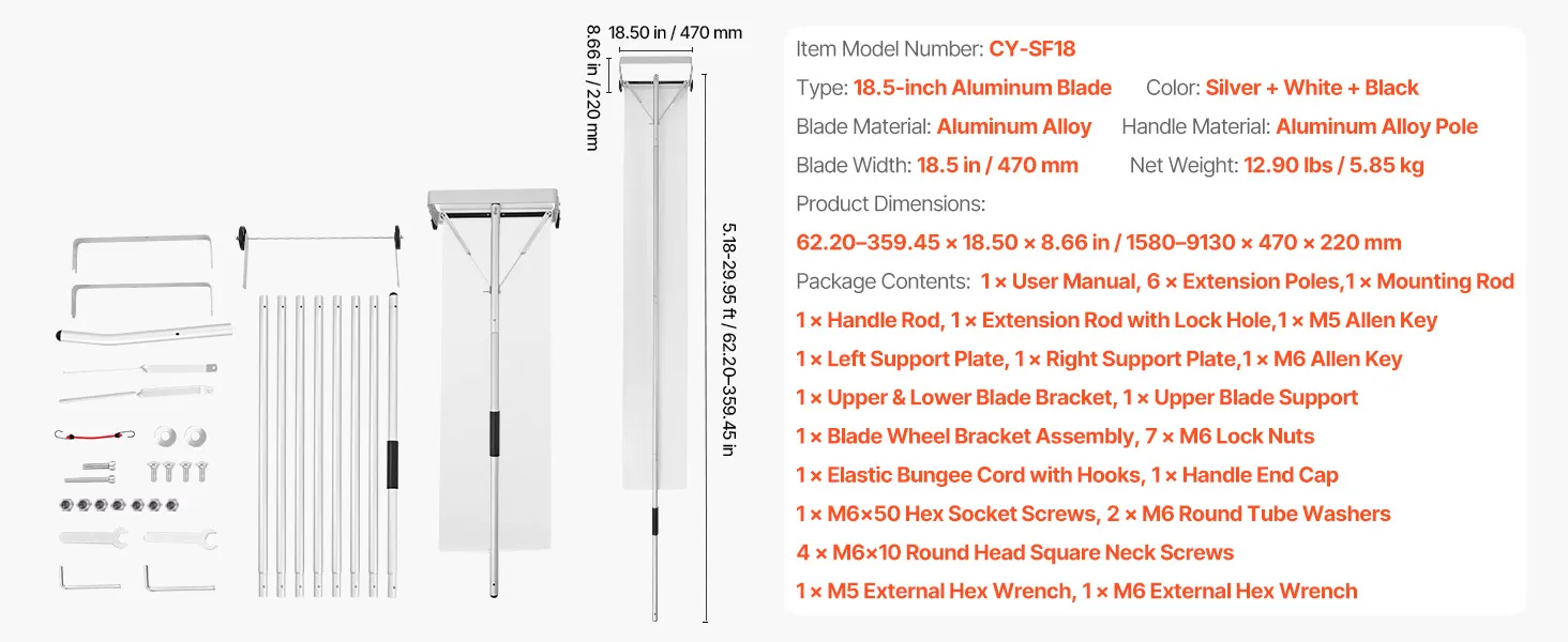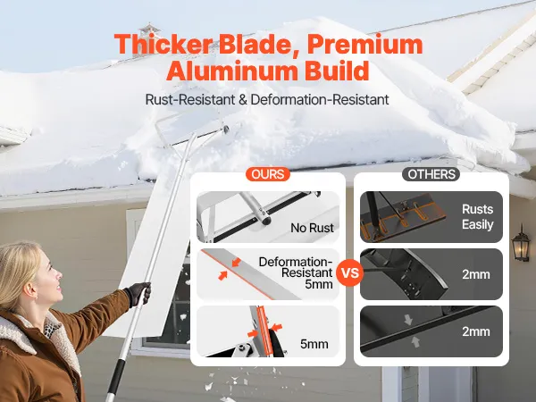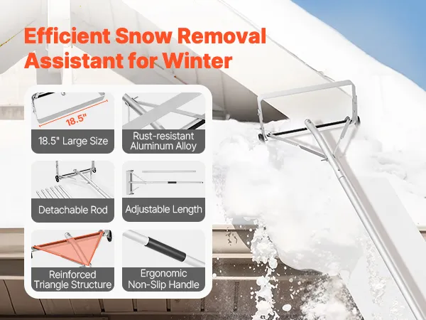 Raspador extra ancha: El rastrillo de nieve para techo está equipado con un raspador de 47 cm para limpiar eficientemente la nieve del techo, especialmente adecuado para áreas grandes. Permite limpiar más nieve de una sola vez, reduciendo las operaciones repetidas y ahorrando esfuerzo