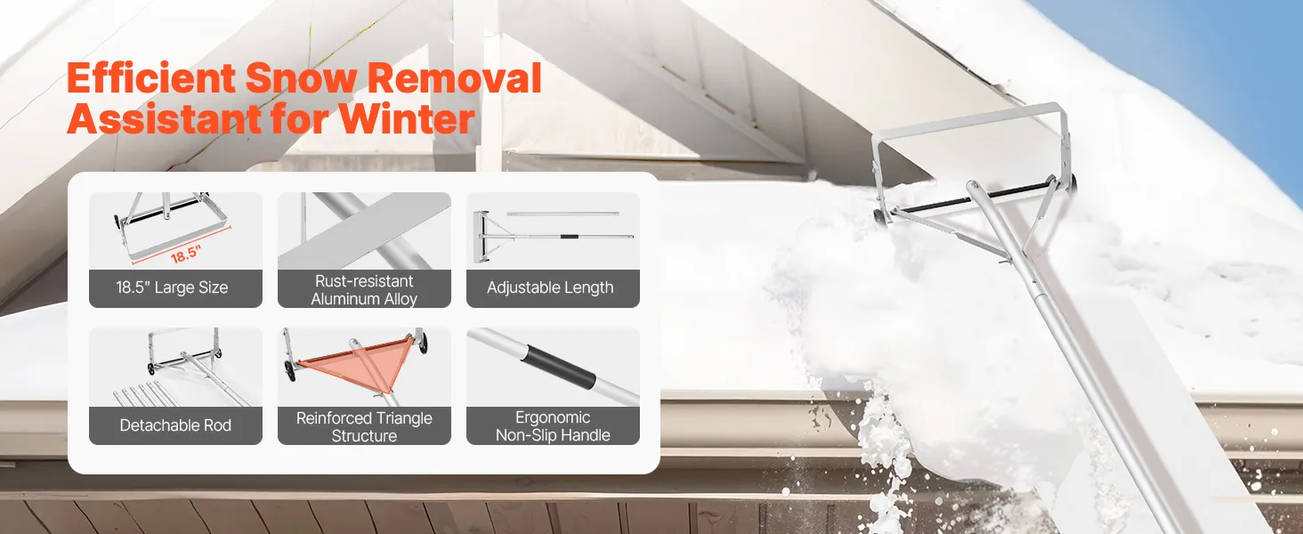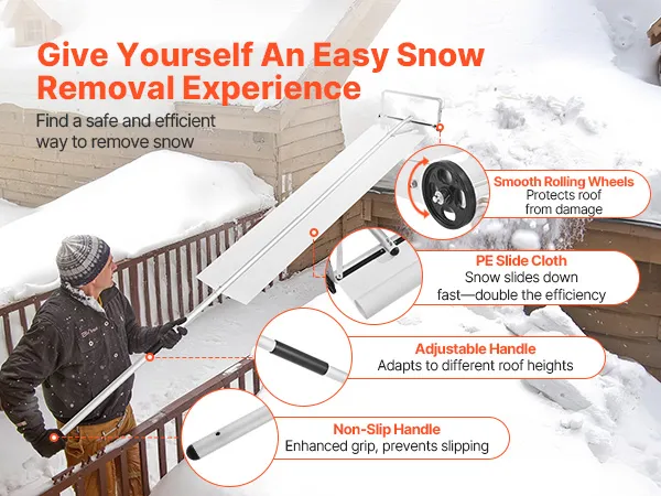Ruedas de deslizamiento suave: Las ruedas de los rastrillos para quitar nieve evitan que la superficie del techo se raye o dañe. El diseño de las ruedas garantiza un deslizamiento suave en pendientes o superficies irregulares, mejorando el control para una limpieza de nieve más precisa