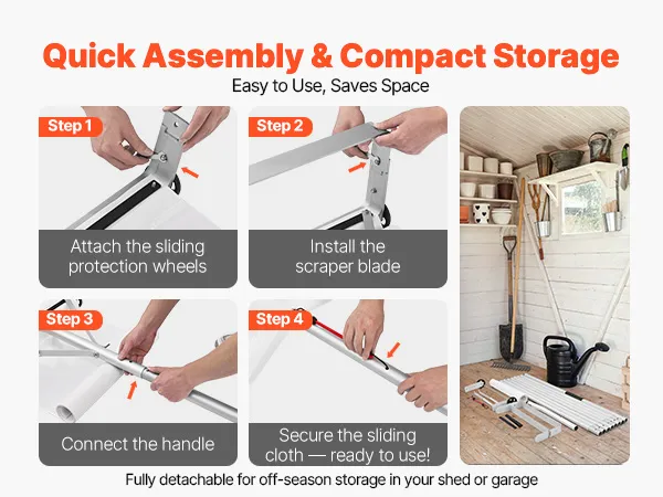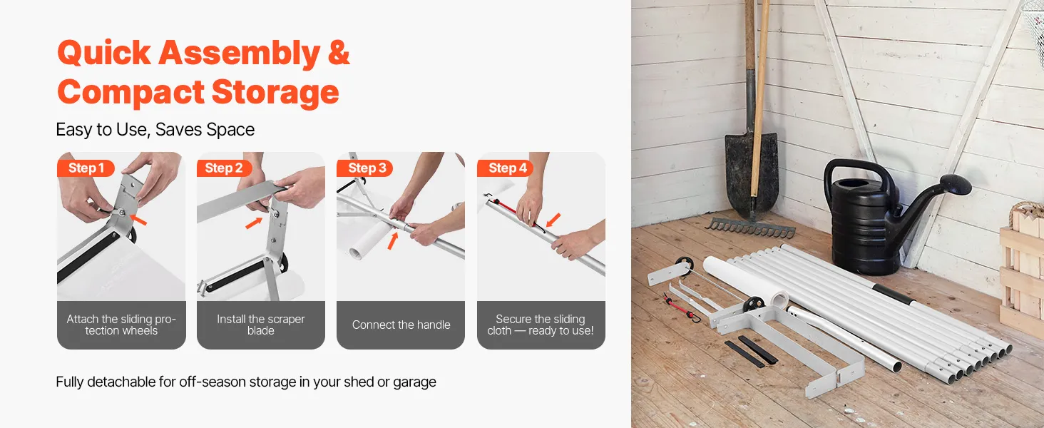Fácil instalación y almacenamiento: El rastrillo de techo se monta fácilmente sin herramientas. El mango desmontable ahorra espacio y permite un almacenamiento compacto. Es ideal para techos de viviendas, garajes y coches, para limpiar la nieve y las hojas caídas sin esfuerzo