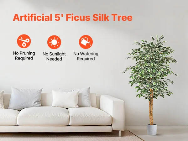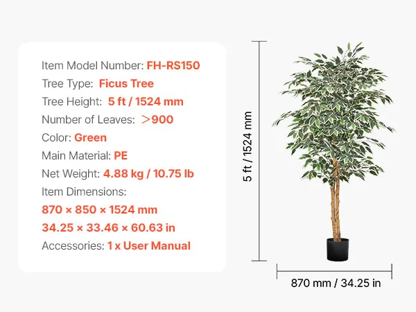 VEVOR Árbol Artificial de Ficus Alto de 1524 mm Planta Artificial de PE para Decoración Árbol Verde Planta Falsa para Hogar, Oficina, Hotel, Centro Comercial, Interior y Exterior, Maceta Negra