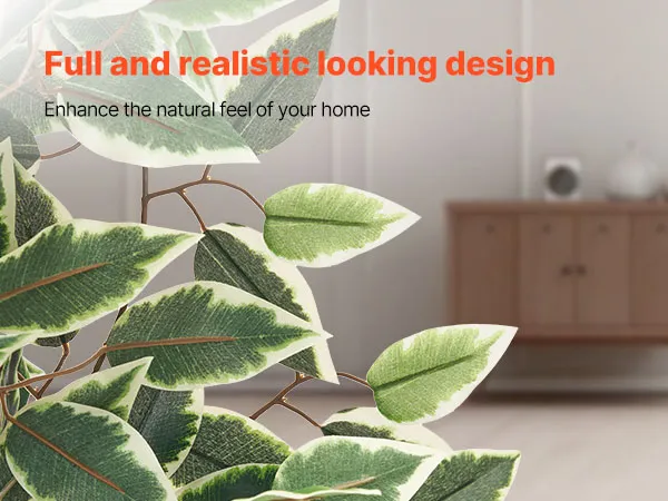 Ficus perenne realista: Este árbol artificial presenta hojas realistas con ricas texturas y un color verde intenso. Elegante y realista, realza salas de estar, oficinas y ventanas durante todo el año
