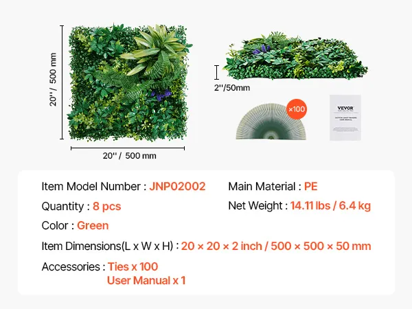 Área de cobertura de 22,22 pies cuadrados: Cada juego de pared con vegetación artificial incluye 8 paneles, que cubren hasta 22,22 pies cuadrados (aprox. 2 metros cuadrados). Antes de comprar, puede medir su espacio y determinar la cantidad adecuada necesaria para lograr la cobertura deseada
