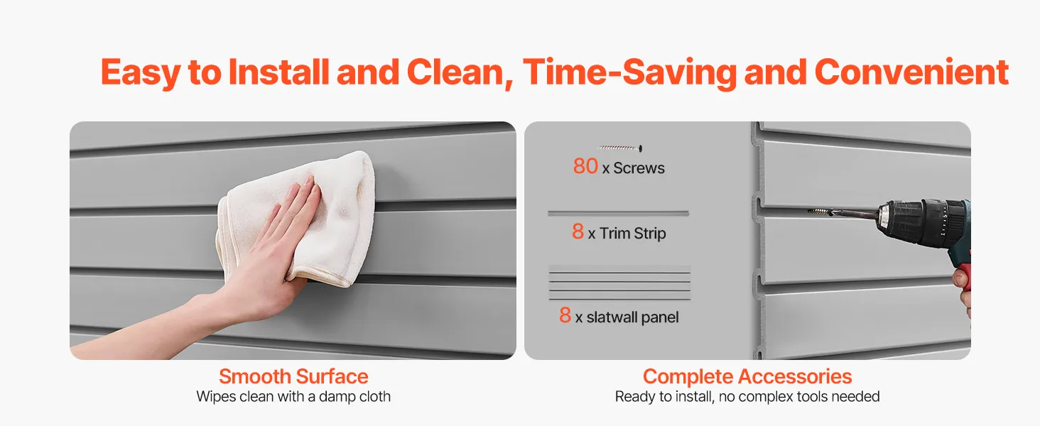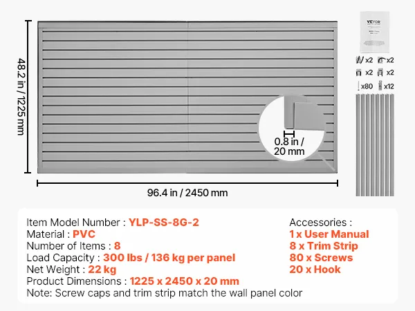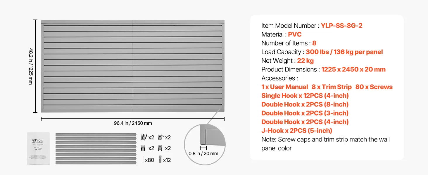 VEVOR Paneles de Pared de Listones de PVC 1225 x 2450 x 20 mm para Garaje con Accesorios, Panel de Listones Ajustable con Estructura de Acoplamiento y Corte para Almacenamiento y Exhibición, Gris