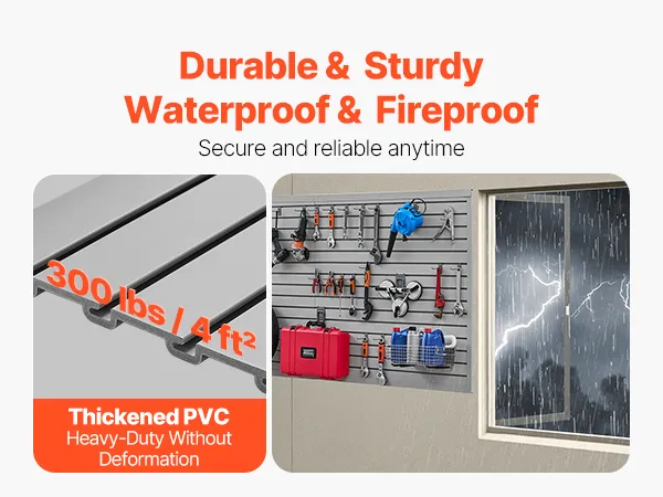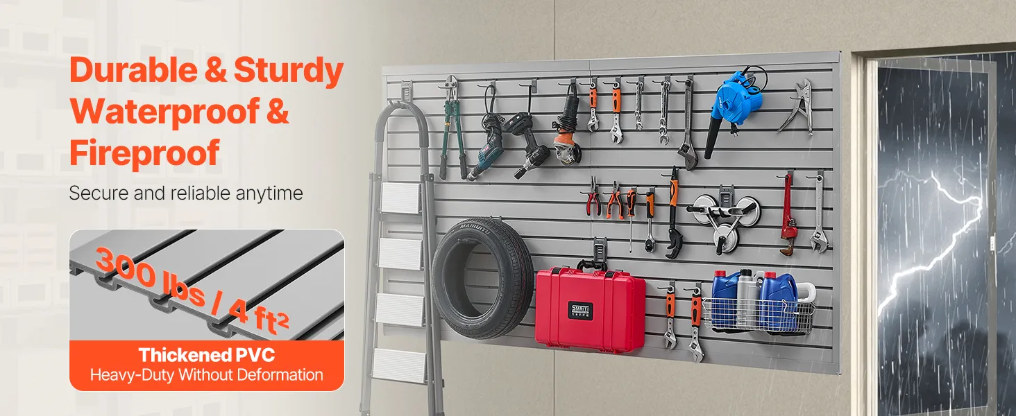 Fuerte capacidad de carga: El panel de pared de listones puede soportar hasta 300 libras/4 pies², lo que proporciona un almacenamiento estable y eficiente para diversos artículos pesados como martillos, taladros, escaleras y más, lo que lo hace ideal para usar en garajes, talleres y otros espacios