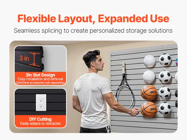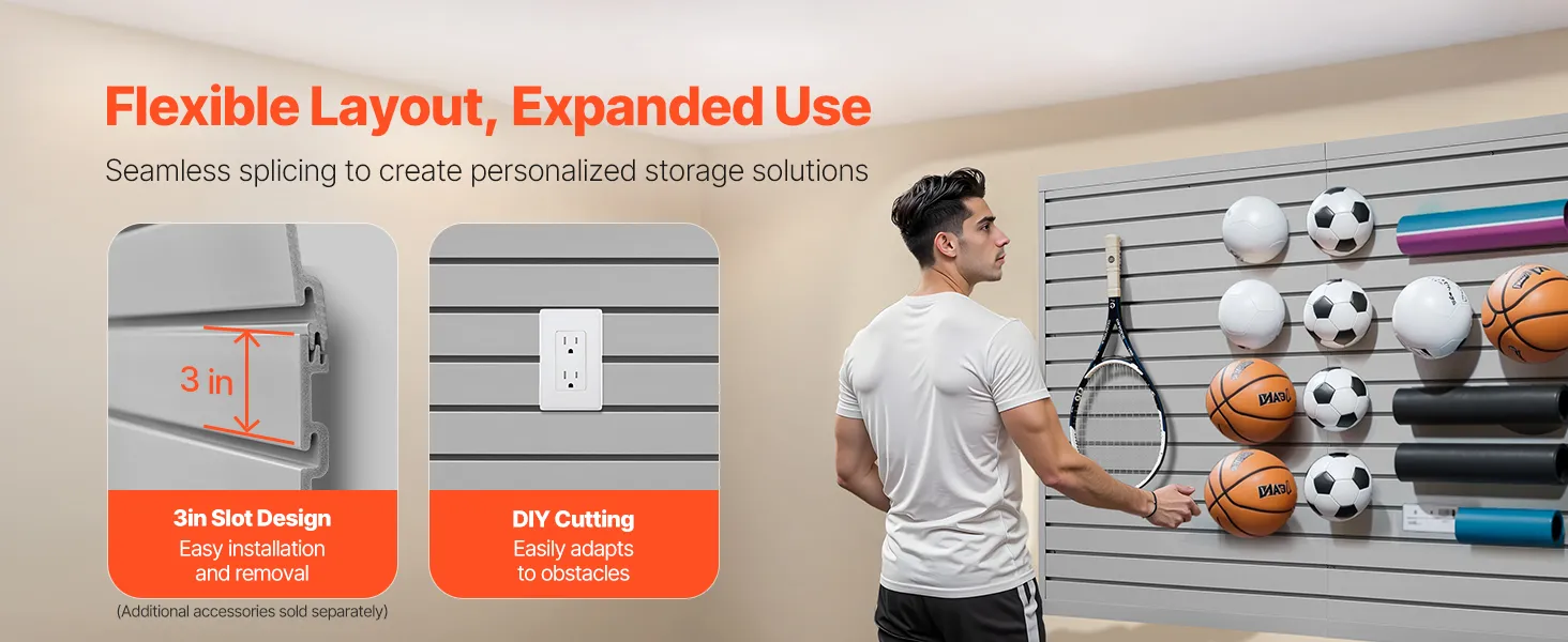 El diseño de ranura de 3 pulgadas de ancho en el panel de pared de listones es compatible con ganchos, soportes, estantes y otros accesorios de almacenamiento universales, lo que facilita agregar o quitar herramientas grandes y piezas pequeñas.