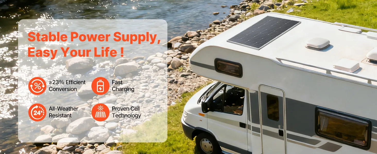Amplias aplicaciones: Ideal para instalación plana en techos, granjas, patios, vehículos recreativos, botes o vehículos con techo plano y cabañas fuera de la red, este panel solar enmarcado proporciona energía constante y confiable para electrodomésticos, iluminación de patio, abridores de portones, equipos de vehículos recreativos, etc