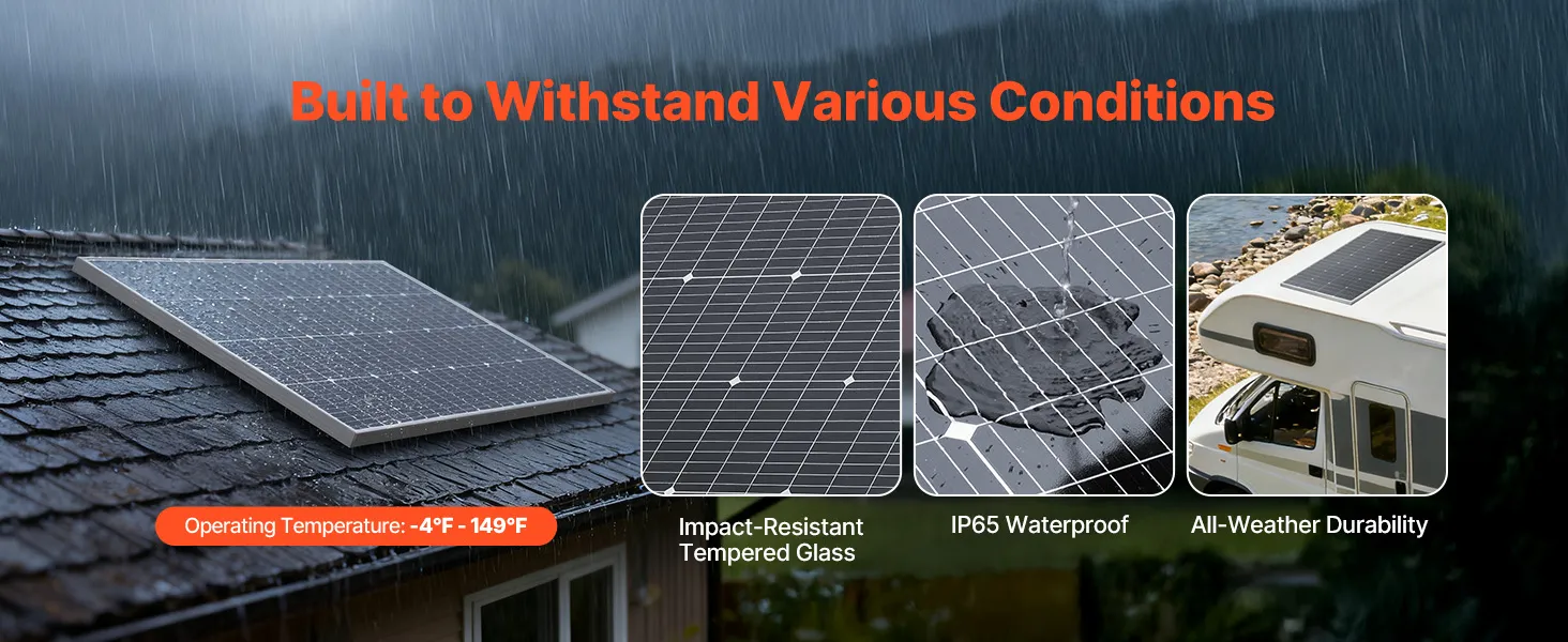 Mayor durabilidad: Construido para durar con vidrio templado y marco de aluminio anticorrosión, nuestro panel solar de alta eficiencia cuenta con clasificación de protección IP65 y funciona de manera confiable de -20 °C a 65 °C, brindando un rendimiento duradero en entornos al aire libre