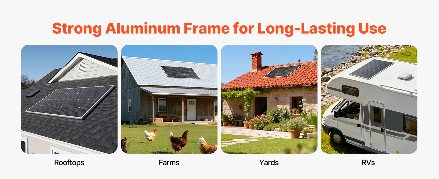 Este panel solar cuenta con un marco de aluminio resistente, lo que lo hace ideal para instalaciones a largo plazo en techos planos, techos de casas, granjas, patios o vehículos recreativos, proporcionando un suministro de energía constante y confiable. (No incluye soportes de montaje).
