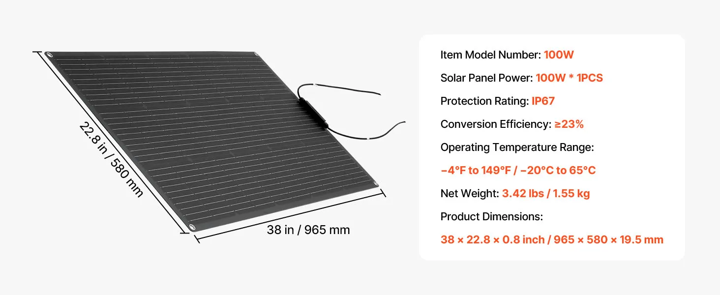 VEVOR Panel Solar Flexible Monocristalino de 100 W, Cargador Monofásico Fuera de Red con Eficiencia del 23 % y Salida MC4, para Superficies Curvas de Cabinas de Vehículos Recreativos y Marinos