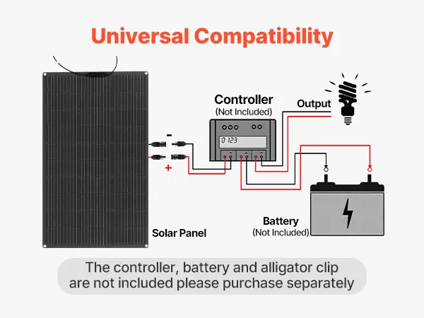Fácil conexión: Diseñado con un cable MC4 incorporado para una configuración rápida y segura, este panel solar flexible se conecta fácilmente al controlador y a la batería, lo que garantiza una salida de energía estable y constante (solo se incluye el panel solar; el controlador, la batería y la pinza de cocodrilo se compran por separado)