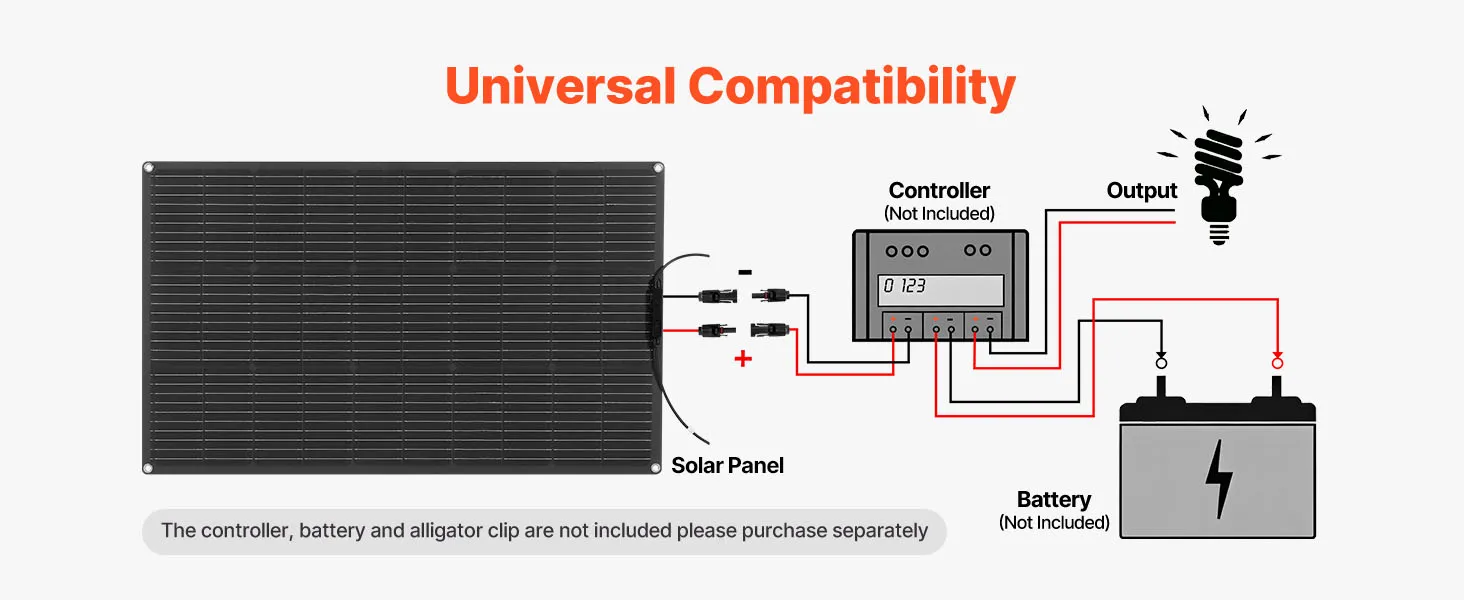 Equipado con un cable MC4 integrado, este cargador solar mono flexible para uso fuera de la red ofrece una conexión segura al controlador y a la batería para un suministro de energía estable. (El controlador, la batería y las pinzas de cocodrilo no están incluidos).