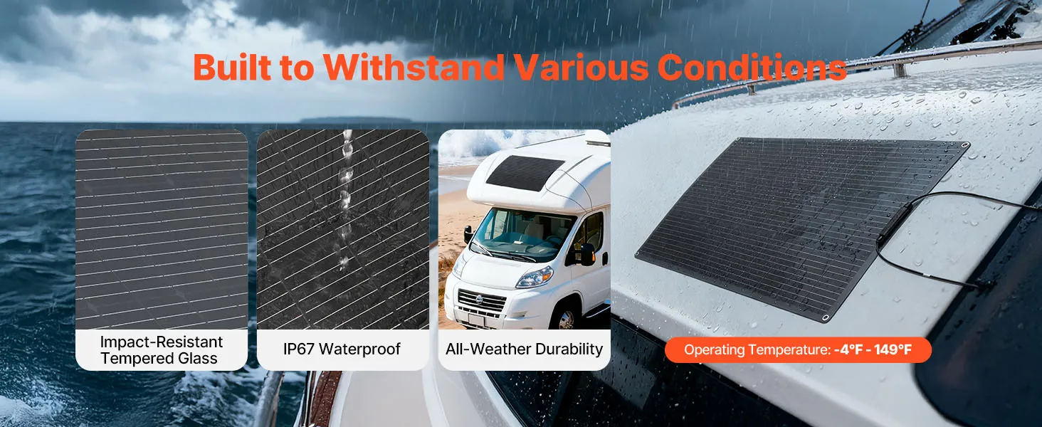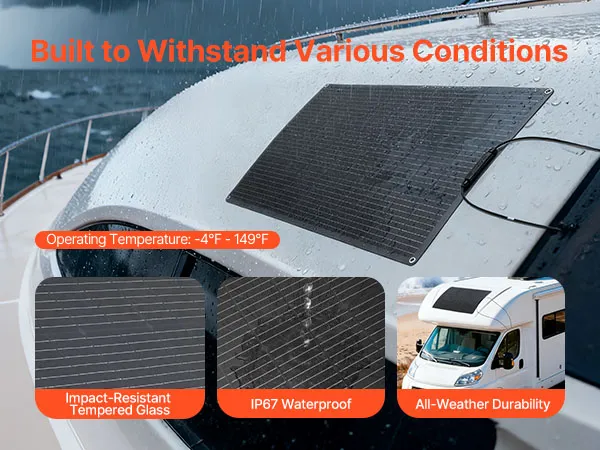 Construido con una clasificación de protección IP67, nuestro panel solar semiflexible funciona de manera confiable de -20 °C a 65 °C, lo que garantiza un rendimiento estable y duradero en diversos entornos al aire libre.