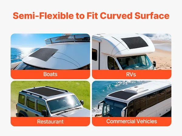 Semiflexible y versátil: Este panel solar monocristalino semiflexible presenta un diseño flexible que se adapta fácilmente a superficies curvas o irregulares, como techos de autocaravanas, barcos, casas y cabañas. Su diseño delgado y ligero facilita la instalación y es adecuado para una amplia gama de aplicaciones fuera de la red eléctrica