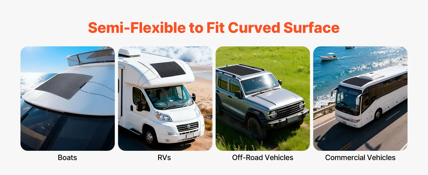 Su diseño ligero y flexible se adapta a autocaravanas, techos de casas, embarcaciones y otras superficies curvas, ofreciendo una solución flexible para aplicaciones fuera de la red eléctrica.