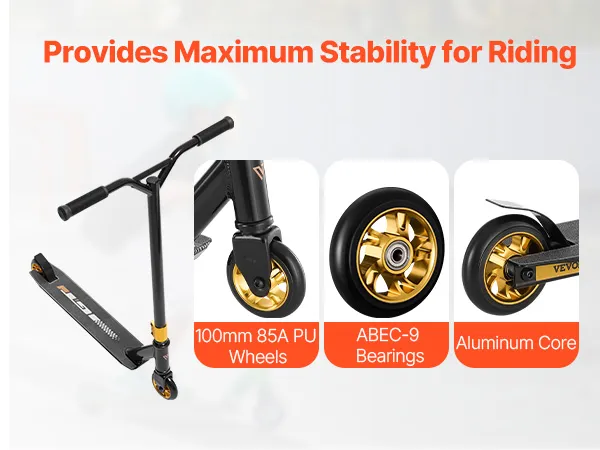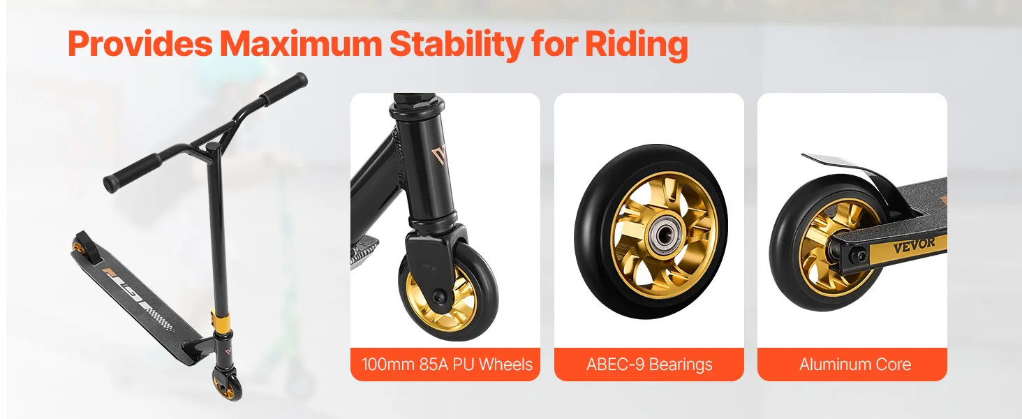 El patinete acrobático para principiantes de nivel intermedio cuenta con una horquilla roscada de aleación de acero reforzado y está equipado con ruedas silenciosas de PU de 100 mm que brindan una conducción suave.