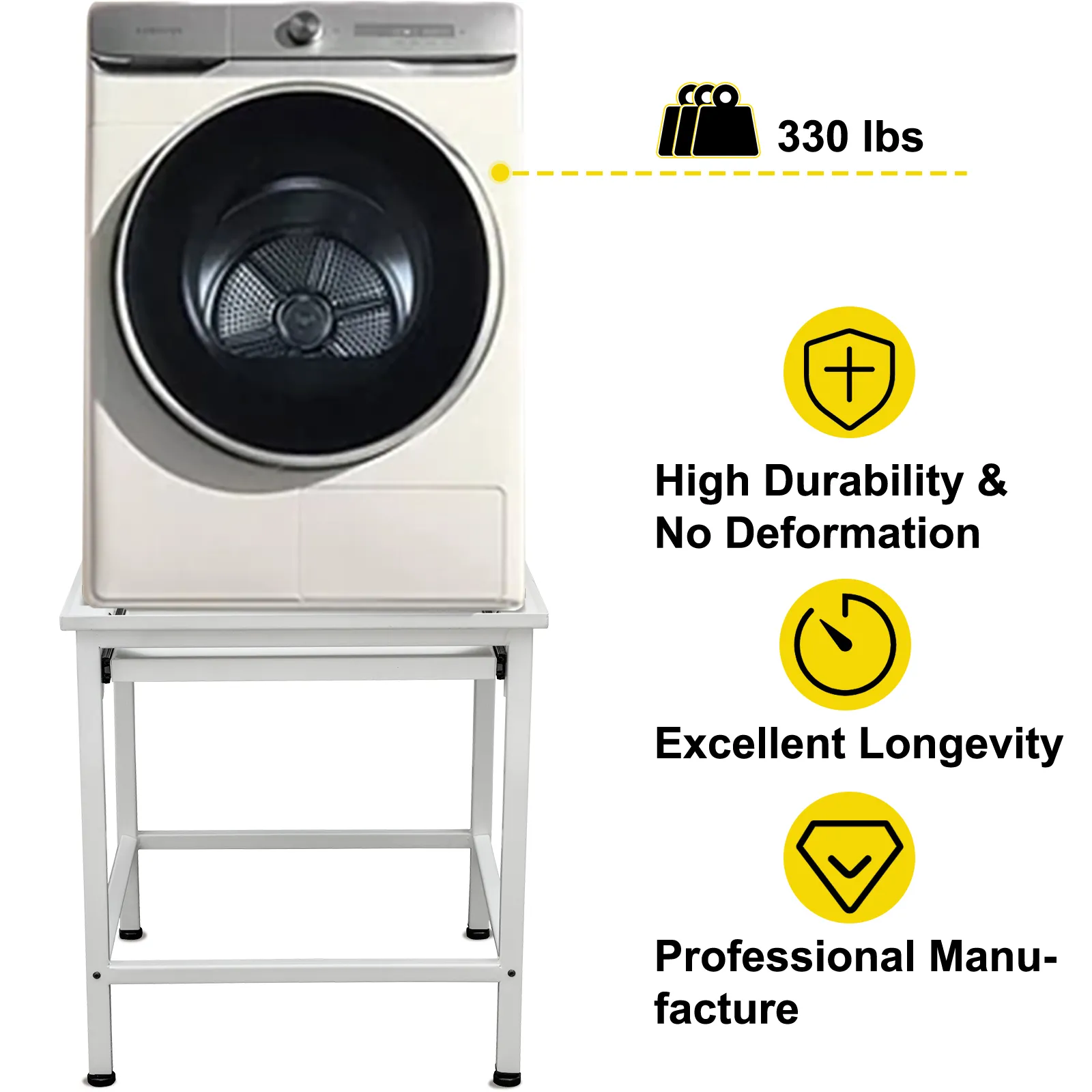 El pedestal para lavadora / secadora de 25,6 pulgadas está hecho de hierro de alta calidad. La capacidad de carga predominante es de hasta 330 libras, por lo que también podemos aplicarla a grandes electrodomésticos.
