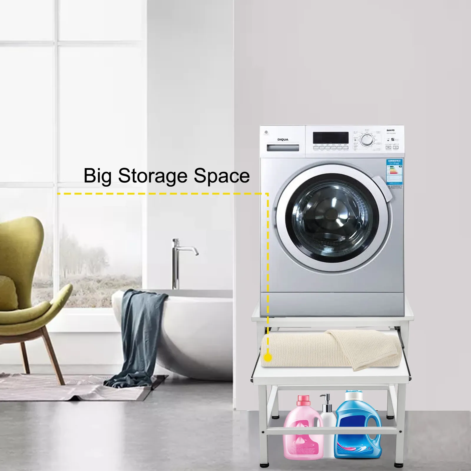 Nuestro pedestal para lavadora y secadora está hecho de hierro de alta calidad. Se presenta con una altura de trabajo ergonómica, una capacidad de carga excepcional de 330 libras y una excelente estabilidad. También proporciona un amplio compartimento de almacenamiento. Por lo tanto, el almacenamiento de detergente y suavizante es bastante conveniente. Es apto para lavadora, frigorífico, secadora, etc.
