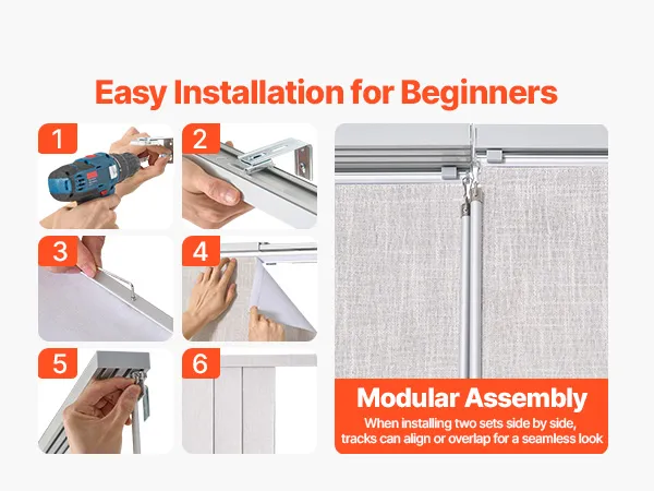 Instalación flexible: Riel ajustable con una longitud de 116-218 cm, ideal para montaje en techo o pared. Recorte fácilmente los paneles de tela para un ajuste perfecto. Al instalar varios juegos uno junto al otro, los rieles se alinean perfectamente con espacios mínimos