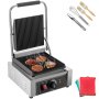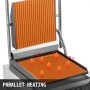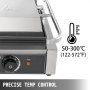 Esta prensa comercial de panini con la carcasa exterior de acero inoxidable y la parrilla de aluminio fundido antiadherente es perfecta para cocinar diversos alimentos como sándwiches de panini, filetes, carne, huevos revueltos, etc. Las placas de ranuras paralelas facilitan el calentamiento uniforme sin voltear la comida... La temperatura es de 50-300 ℃ (122-572 ℉) ajustable. Es perfecto para uso comercial!