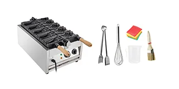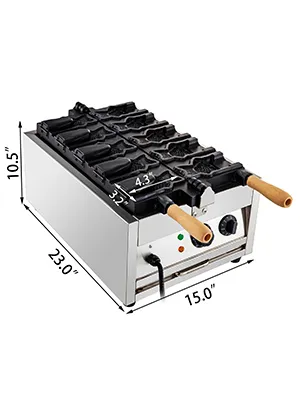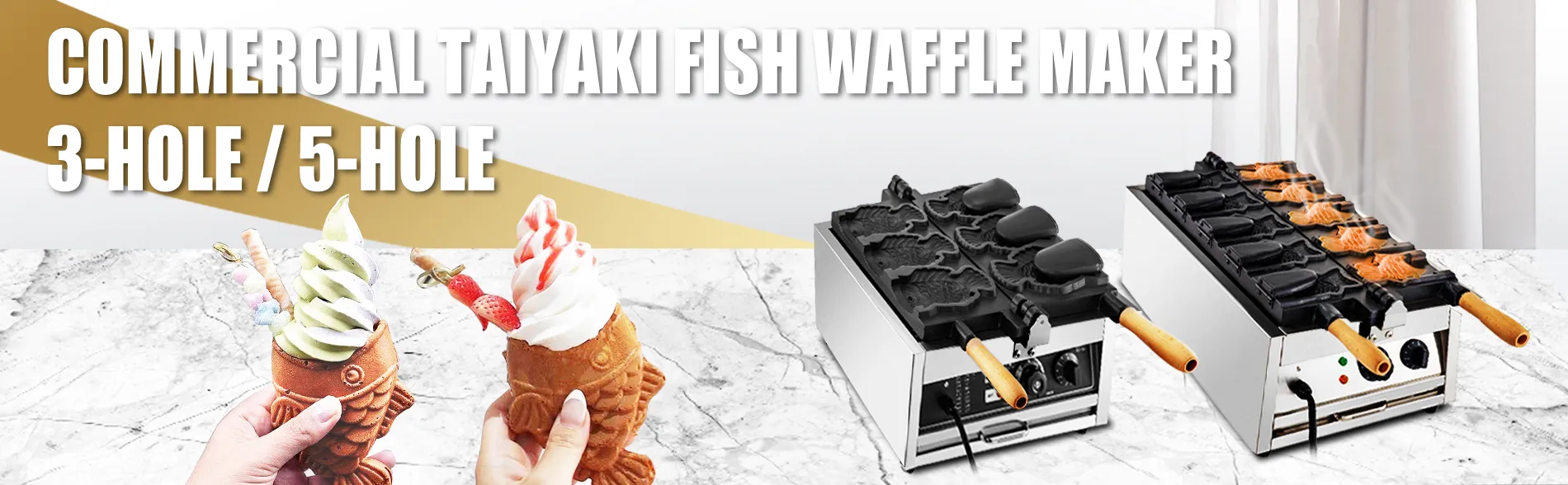El Taiyaki, también conocido como waffles de pescado, se llama así por su forma de pescado. Es muy popular en Corea del Sur y Japón. A la gente de Corea del Sur le gusta mucho por su atractiva apariencia y su delicioso sabor. Aquí tiene una máquina de hacer waffles de pescado de Taiyaki. Puede añadir helado, frijoles rojos, mermelada de arándanos, chocolate o queso en el gofre de pescado, haciéndolo aún más atractivo.