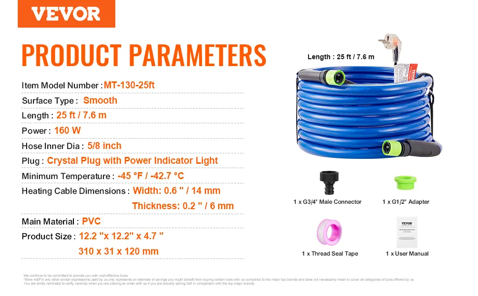 VEVOR Manguera de Agua Potable Calentada para RV 7,6 m Anticongelante -42,7 °C Autorregulación Automática Diámetro Interior de 5/8" con Kit de Accesorios de Conexión Rápida sin Plomo sin BPA
