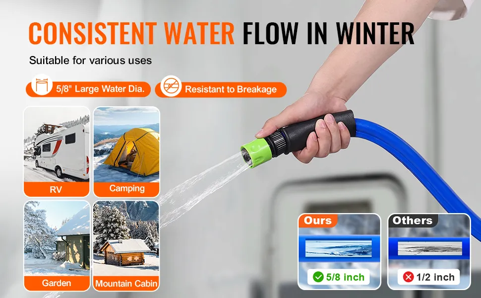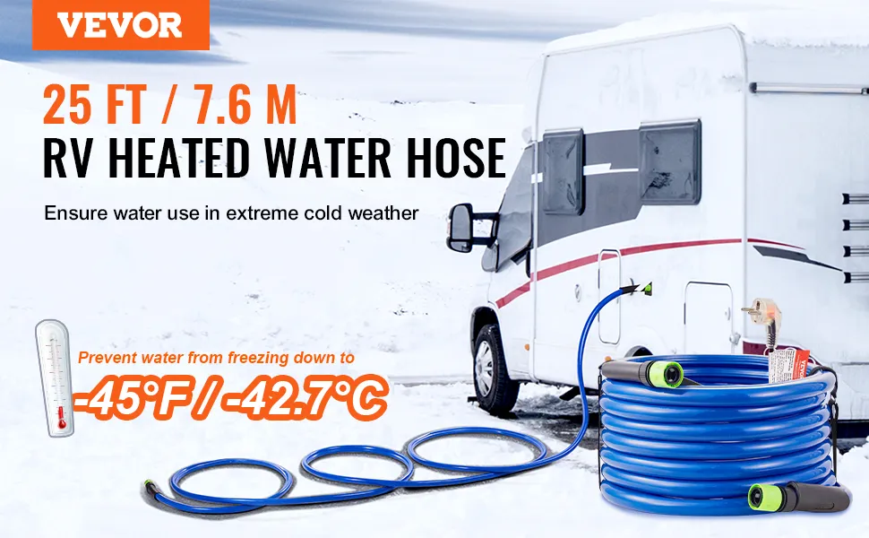 Con una manguera de agua calentada para vehículos recreativos VEVOR, puede disfrutar del uso normal del agua incluso a -45 °F durante el campamento en vehículos recreativos.