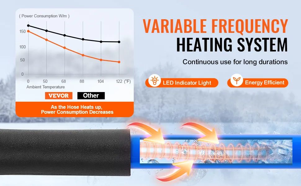 Calentamiento rápido y bajo consumo de energía: El enchufe se ilumina cuando se calienta. La tubería de agua calentada cuenta con un sistema de calefacción de frecuencia variable que se enciende a 46°F/8°C y se apaga a 59°F/15°C, lo que reduce el consumo de energía. Cuenta con un cable calefactor de 0,6"/14 mm para un calentamiento más rápido, envuelto en una capa exterior suave para una distribución eficiente del calor.