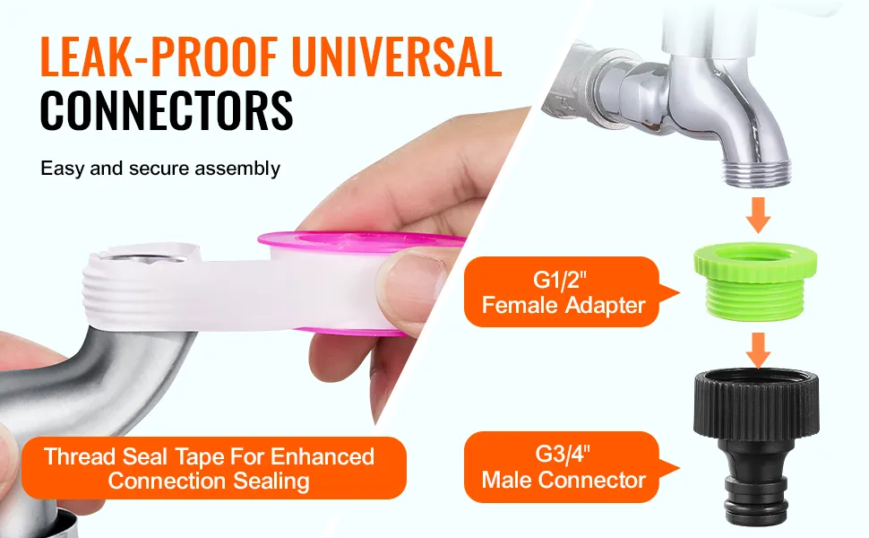 Conectores de manguera a prueba de fugas: Cuenta con un conector hembra de conexión rápida, compatible con la mayoría de las fuentes de agua. Este accesorio versátil puede soportar una presión de agua de 0,6 MPa/80 PSI. Incluye un conector macho G3/4" y un adaptador hembra, además de cinta selladora roscada para un mejor sellado.