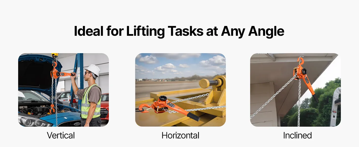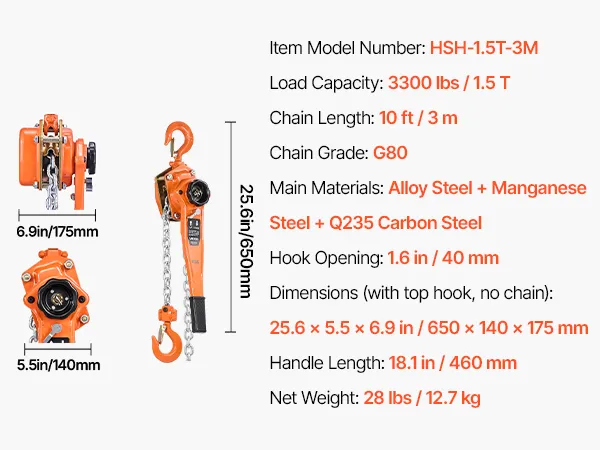 Este polipasto manual de palanca con cadena galvanizada G80 es ideal para tareas exigentes como el movimiento de troncos, maquinaria o vigas de acero. Sus frenos de trinquete dobles tipo Weston y la ranura de la cadena guiada garantizan un funcionamiento suave y seguro.