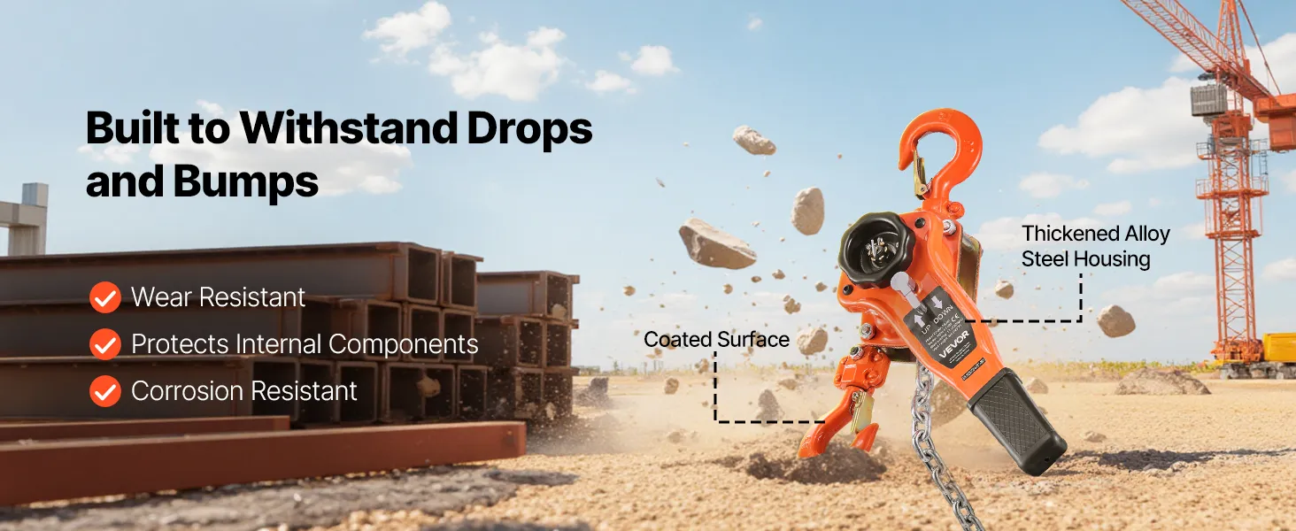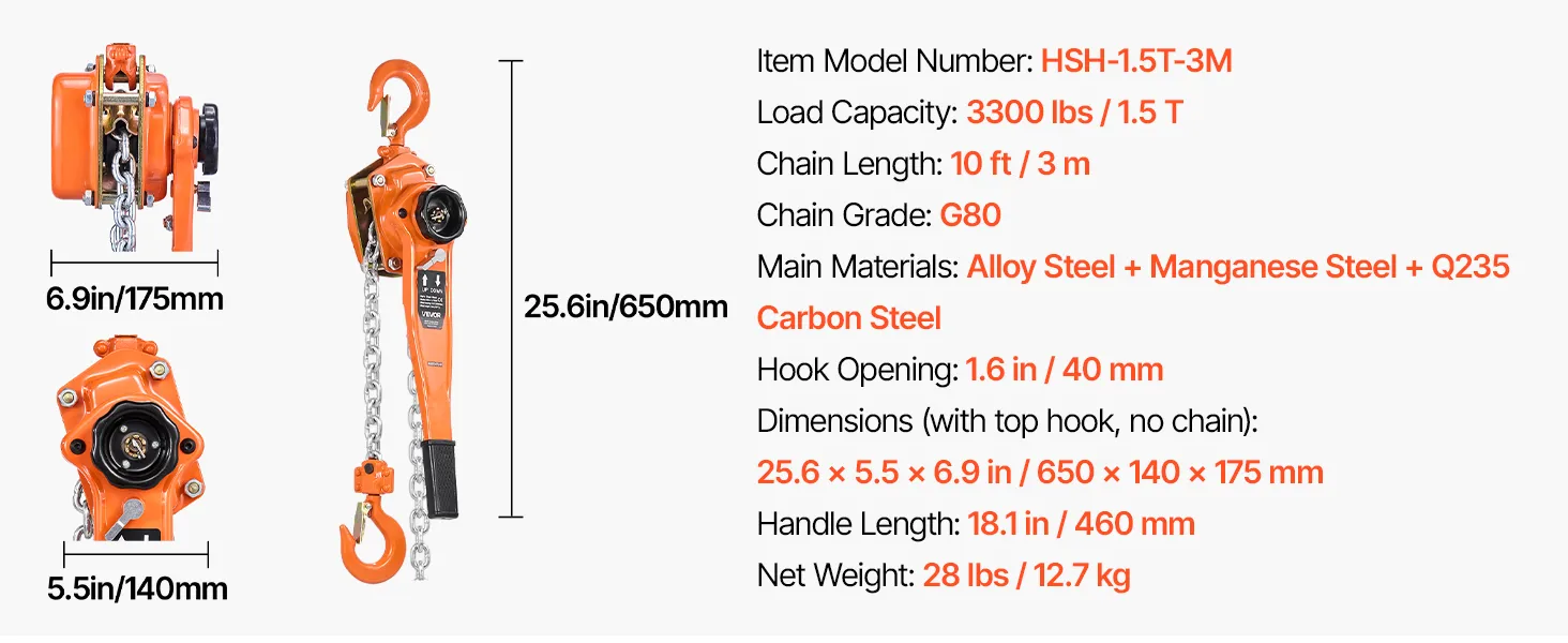 Capacidad máxima de carga: Este polipasto manual de palanca cuenta con una construcción de acero resistente a impactos y roturas, lo que permite a una sola persona mover sin esfuerzo cargas de hasta 1,5 T. Ideal para tirar de árboles caídos, levantar vigas de acero, maquinaria y piezas de motor