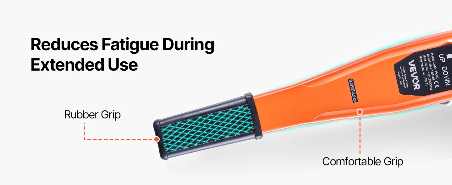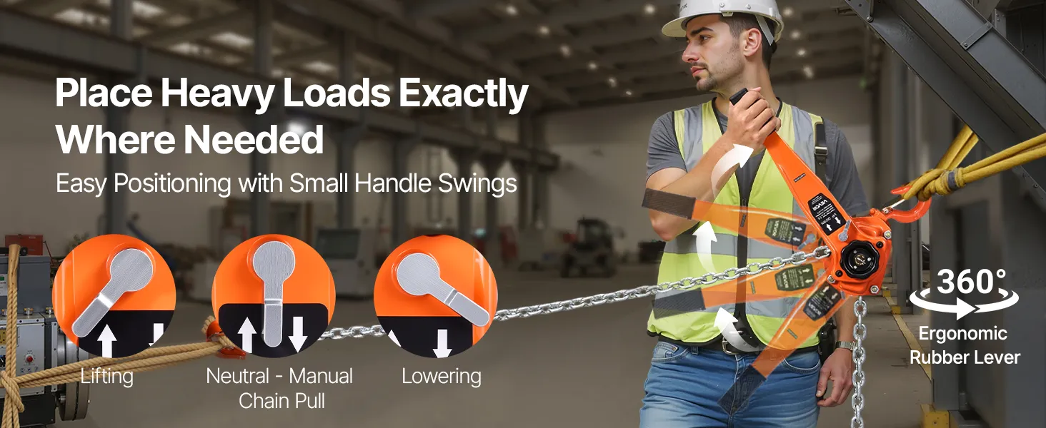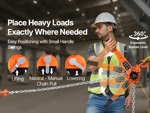 Fácil manejo: Nuestro polipasto de cadena con palanca cuenta con una manija ergonómica giratoria de 360° con agarre antideslizante. Permite mover cargas pesadas con mínimo esfuerzo, incluso en espacios reducidos. Un interruptor de tres posiciones permite alternar entre los modos de elevación, punto muerto y descenso