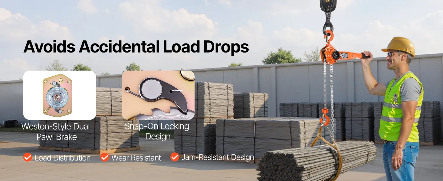 Frenado seguro y fiable: Este polipasto de cadena manual cuenta con un freno de doble trinquete Weston con engranajes para un control preciso. Su robusta construcción evita resbalones y caídas repentinas, distribuye la presión uniformemente, aumenta la seguridad y prolonga la vida útil