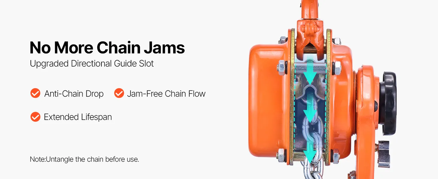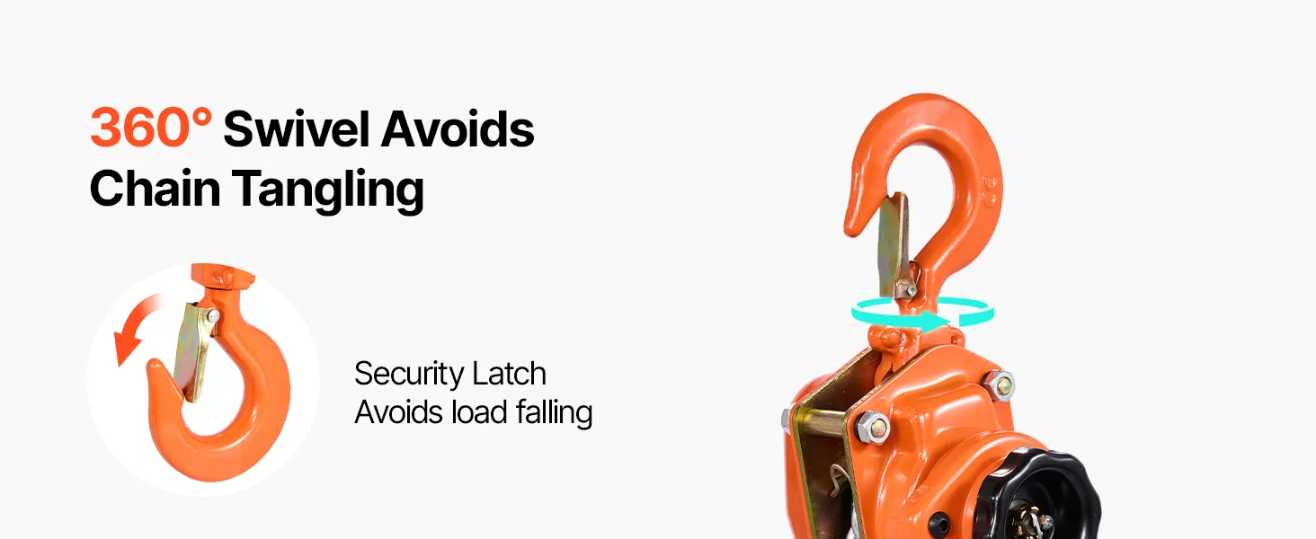 Funcionamiento suave: Este polipasto de cadena cuenta con una ranura guía mejorada para una elevación suave y sin atascos. El gancho giratorio de 360° permite un uso seguro en múltiples ángulos, evitando torceduras y aumentando la eficiencia en aplicaciones de elevación exigentes