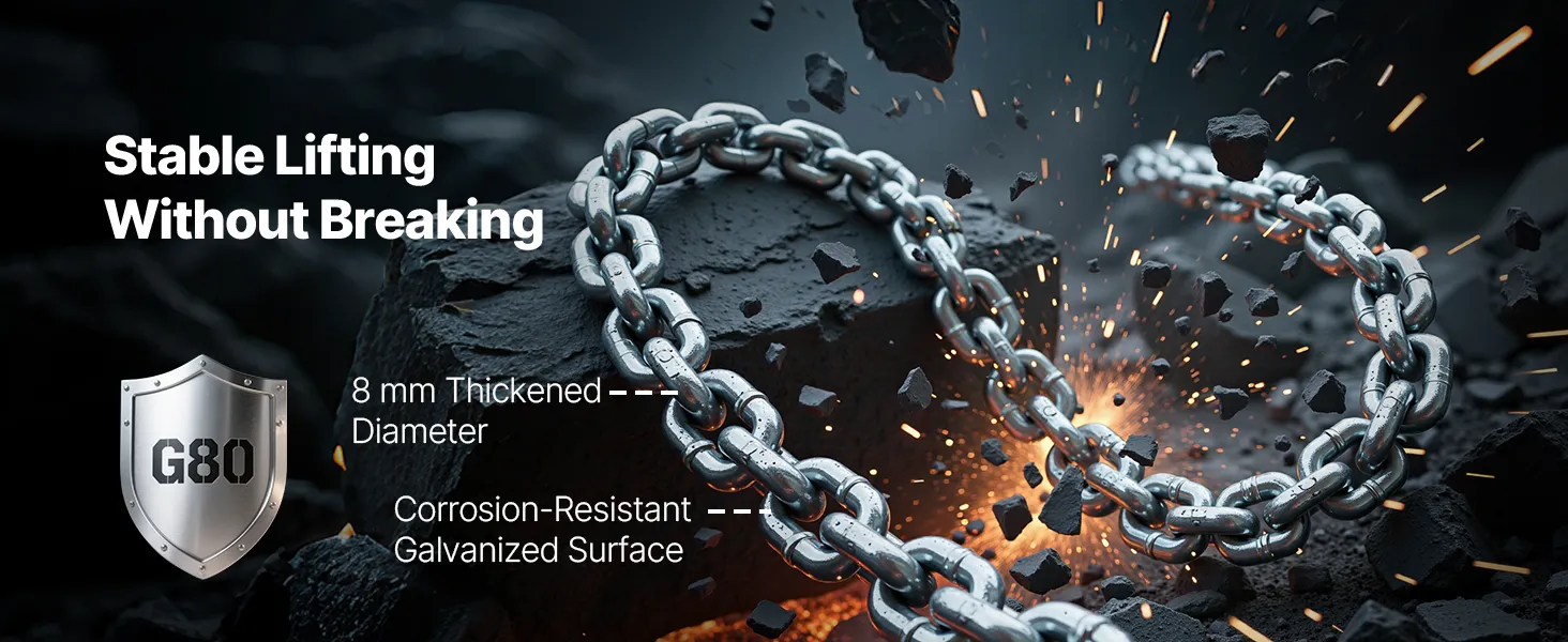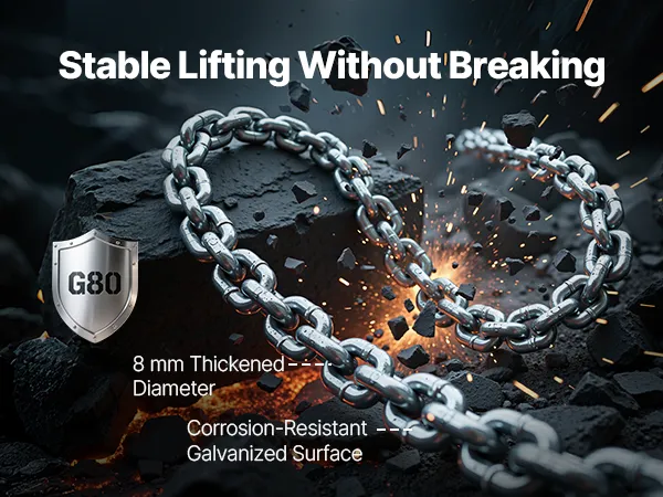 Cadena Industrial G80: El polipasto de cadena incorpora una cadena de aleación G80 galvanizada de 3 m de longitud y 8 mm de grosor, resistente a la corrosión. Robusta y duradera para aplicaciones exigentes, garantiza una elevación fiable en construcción, almacenes y aplicaciones industriales