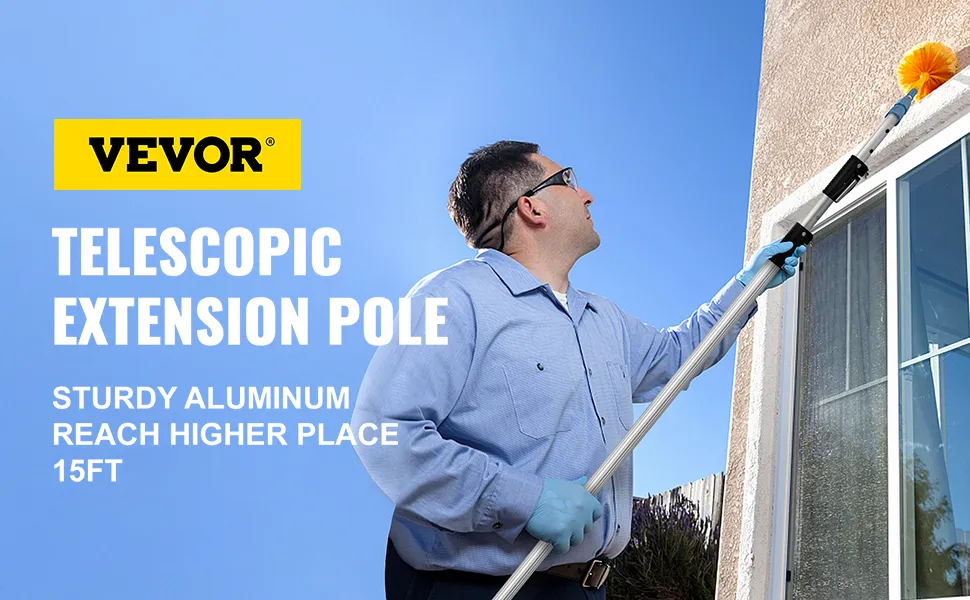 Nuestro palo telescópico mide 15 pies / 4,6 m de largo, lo que le ayudará a tocar las superficies difíciles de alcanzar, como techos altos y ventanas exteriores sin escalera.