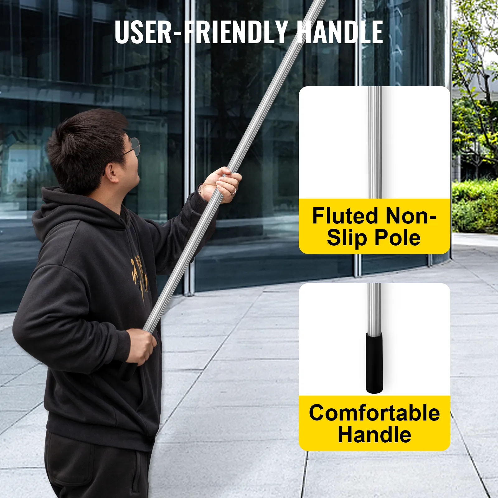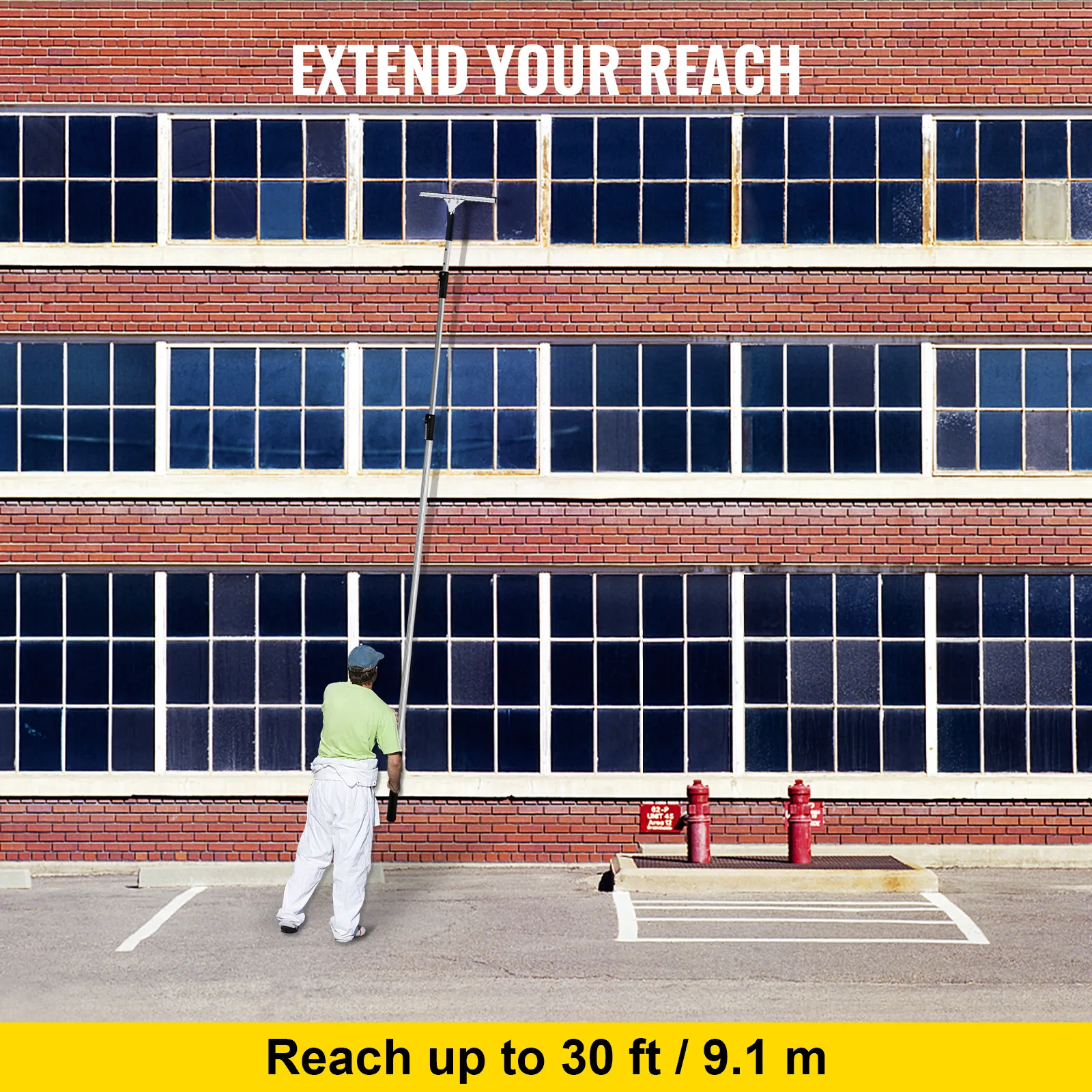 Nuestro palo telescópico mide 30 pies / 9,1 m de largo, lo que le ayudará a tocar las superficies difíciles de alcanzar, como techos altos y ventanas exteriores sin escalera.